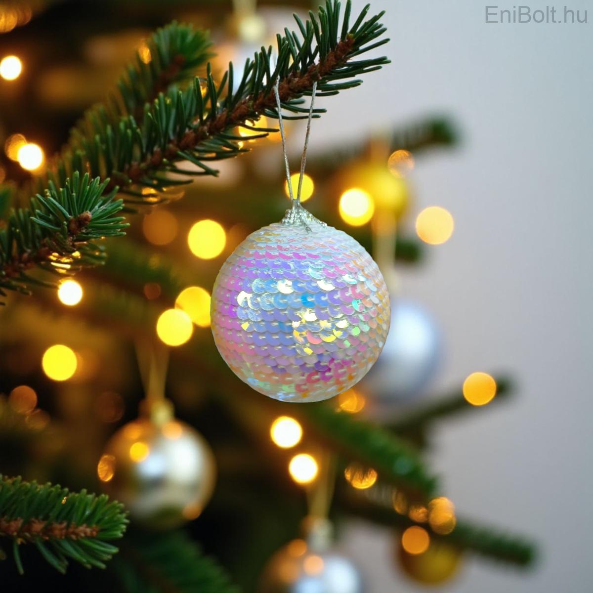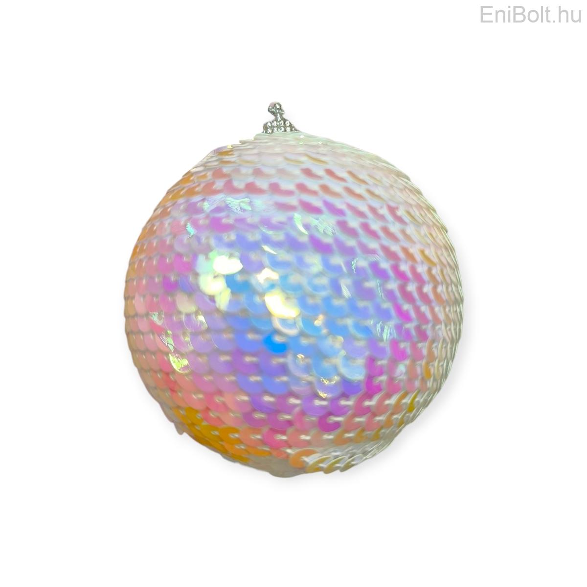Elegáns karácsonyfadísz, fehér gömb irizáló flitterekkel, melyek a fényben szivárványszerűen csillognak.