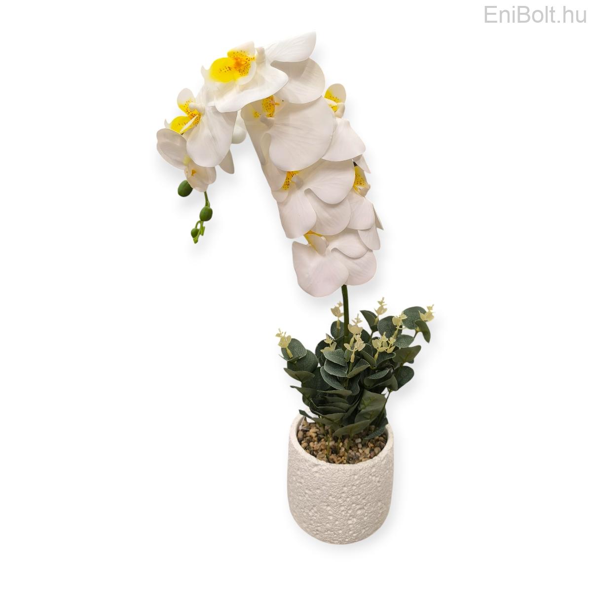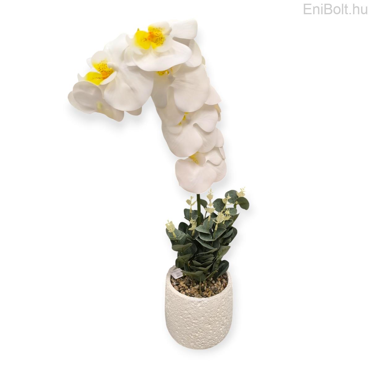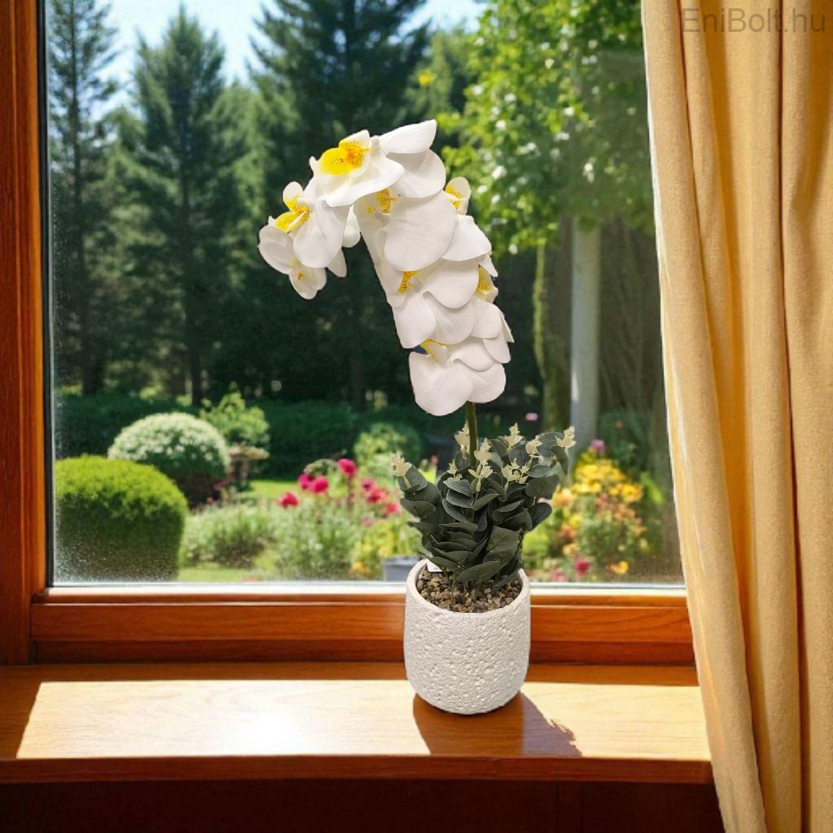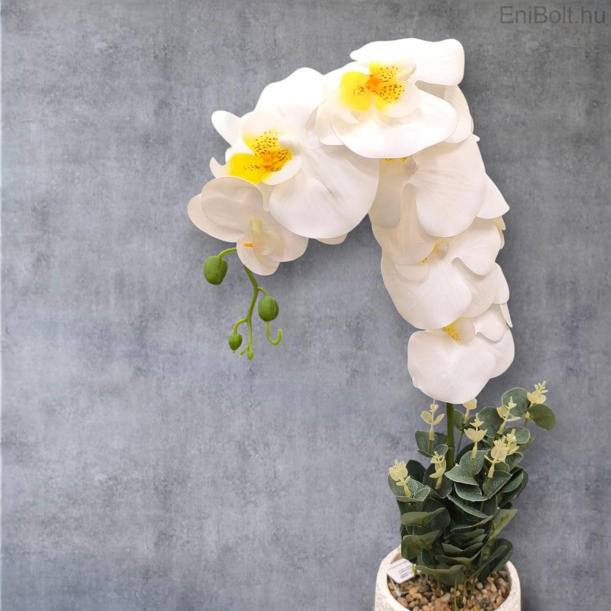 Ez a 54 cm magas, fehér kerámia díszedény élethű fehér orchideával stílusos kiegészítője lehet bármely nappalinak, hálószobának vagy irodának. Klasszikus, letisztult megjelenésével eleganciát és frissességet sugároz.