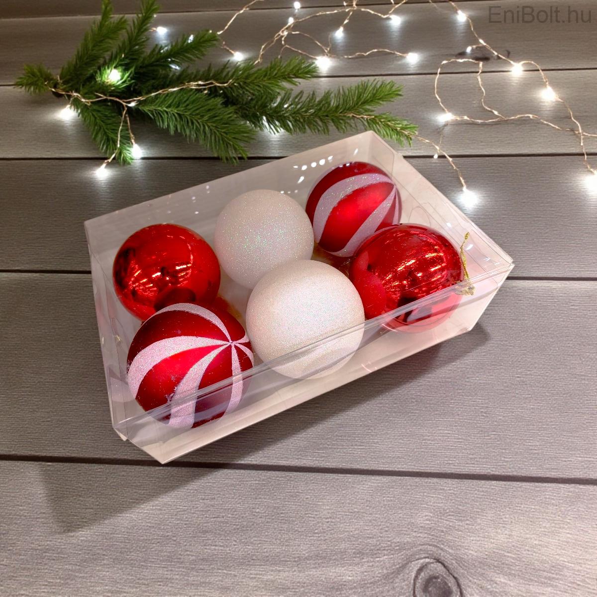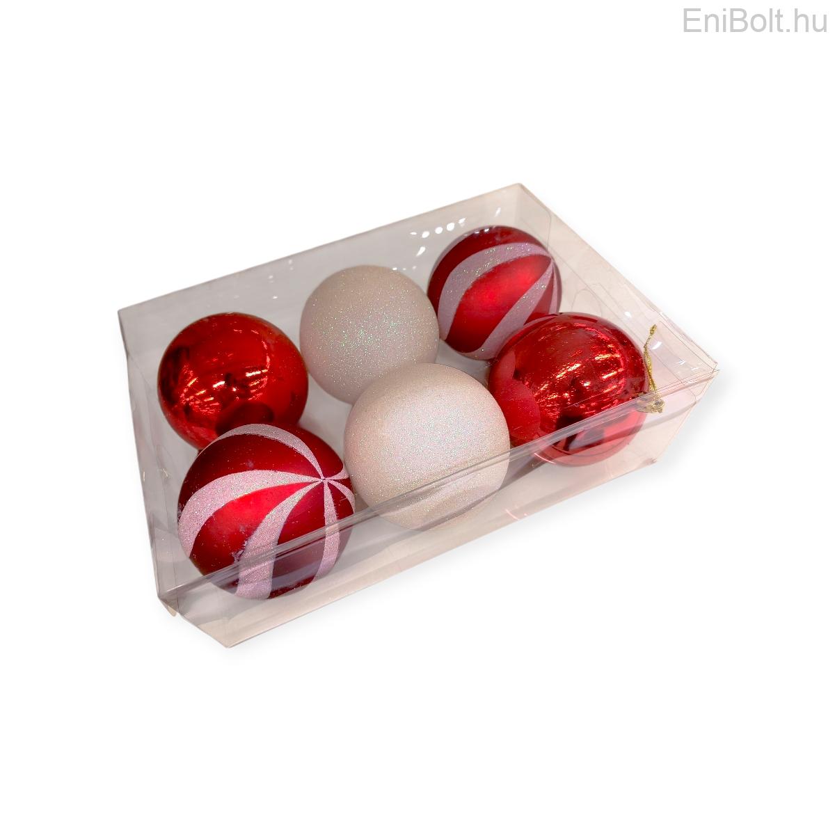 Fehér-piros cukorka karácsonyi gömb szett csillámmal Ø10cm – 6db