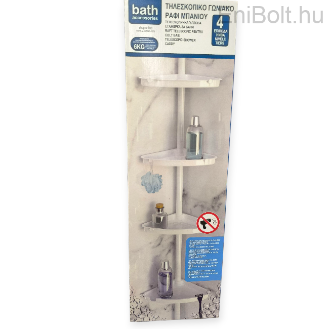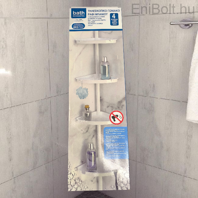 Praktikus és helytakarékos fehér teleszkópos sarokpolc, amely ideális megoldás a zuhanyzóban vagy a fürdőkádban történő tároláshoz. A 4 műanyag polc elegendő helyet biztosít samponok, tusfürdők, szappanok, borotva és más piperecikkek számára.