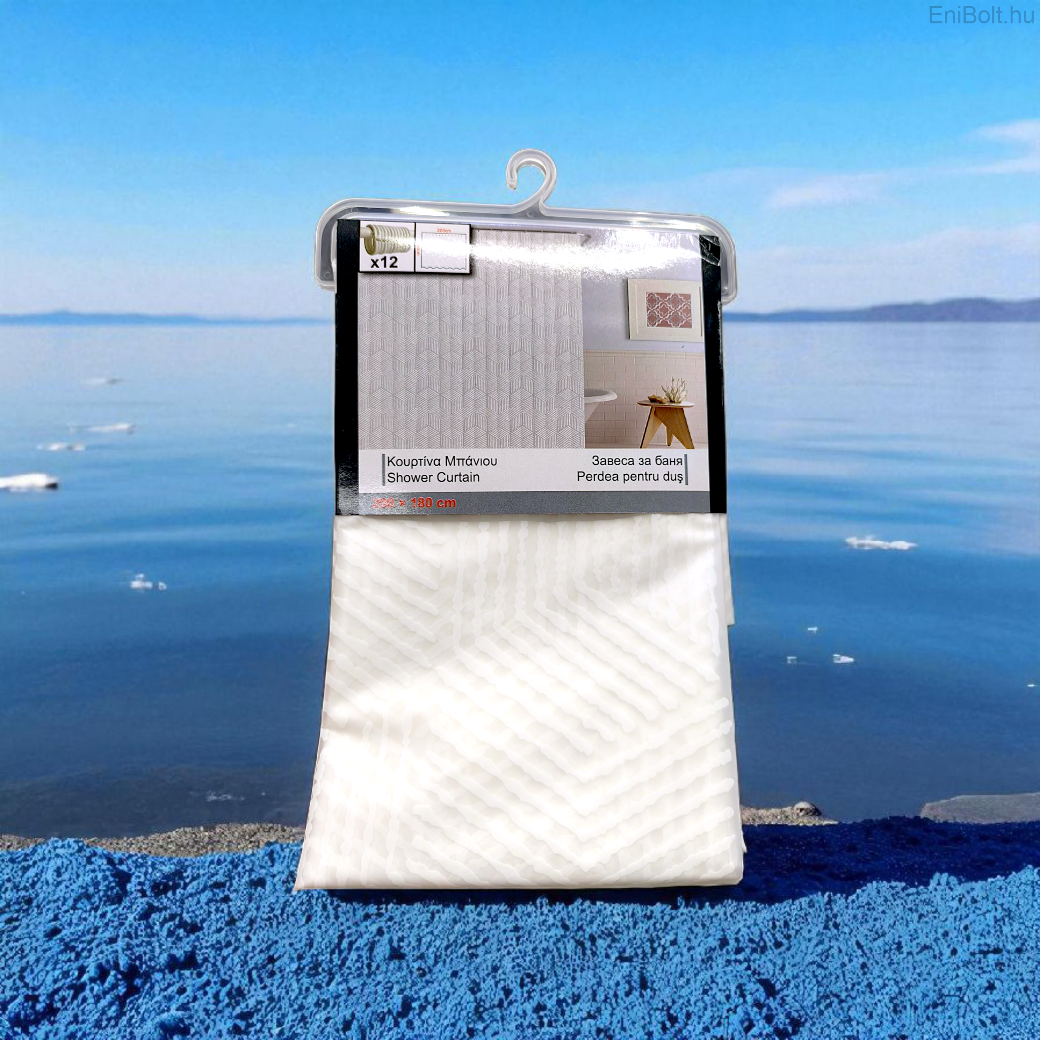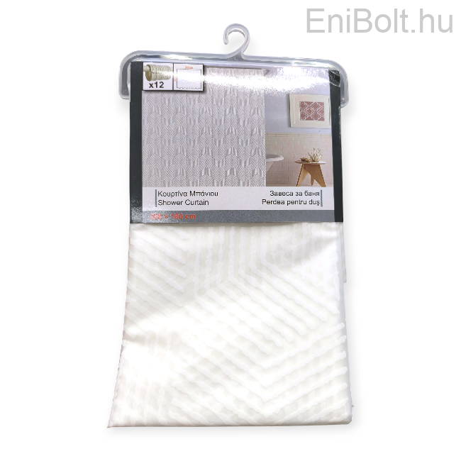 Fehér zuhanyfüggöny – 180x180 cm, PEVA, lineáris mintával, 12 gyűrűvel