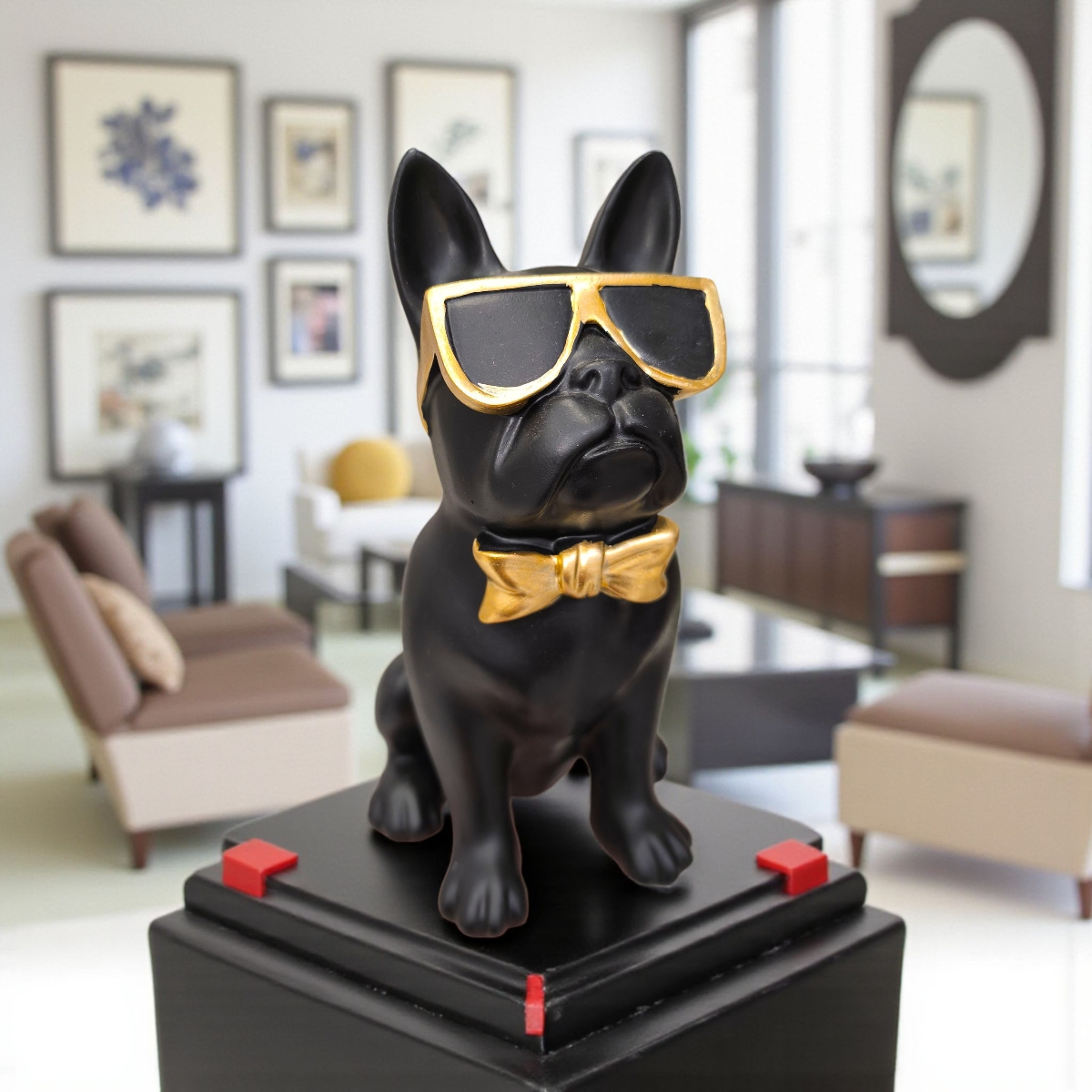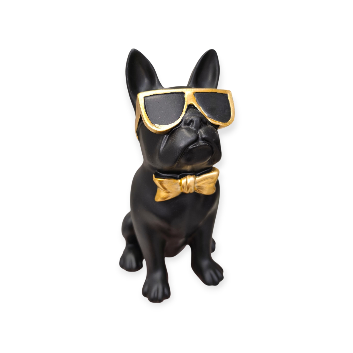 Ez a fekete dekoratív kutyafigura arany napszemüveggel és csokornyakkendővel egyedi karaktert visz bármely térbe. Modern és humoros megjelenése feldobja a nappalit, dolgozószobát vagy előszobát.