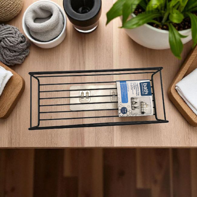 Kezdőlap » Rendszerezés és tisztítás » Fürdőszobai kellékek, tárolók » Fürdőszobai polcok » Fekete fém fürdőszobai polc ragasztós rögzítéssel – 27x10,5x5 cm