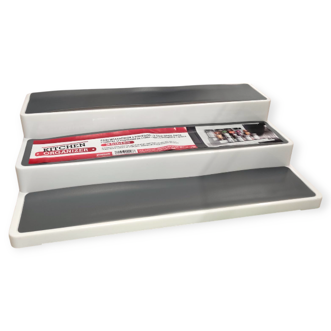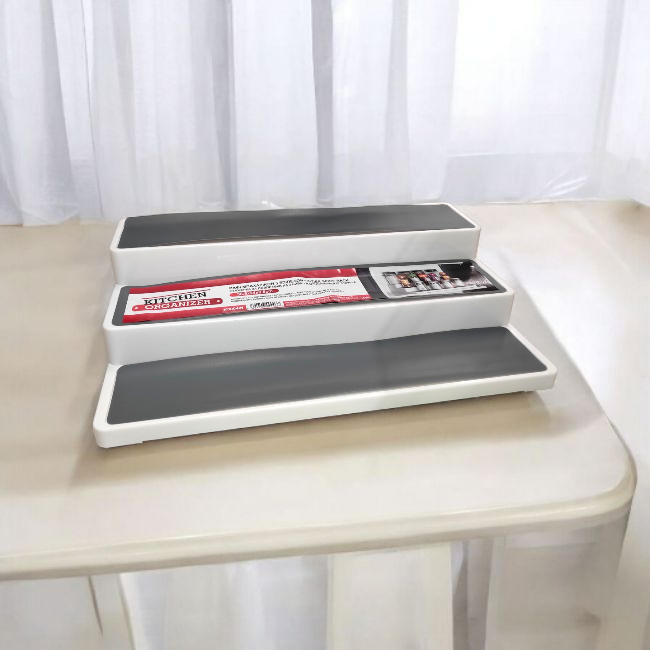 3 szintes műanyag fűszertartó, amely segít rendben tartani a konyhát és a fűszereket. Minden szint 7 cm széles, csúszásmentes felülettel, így stabilan elhelyezhetők rajta a kis és közepes méretű fűszercsomagok. A lépcsőzetes kialakításnak köszönhetően minden fűszer jól látható és könnyen elérhető. Ideális megoldás konyhapultra vagy szekrénybe helyezve.
