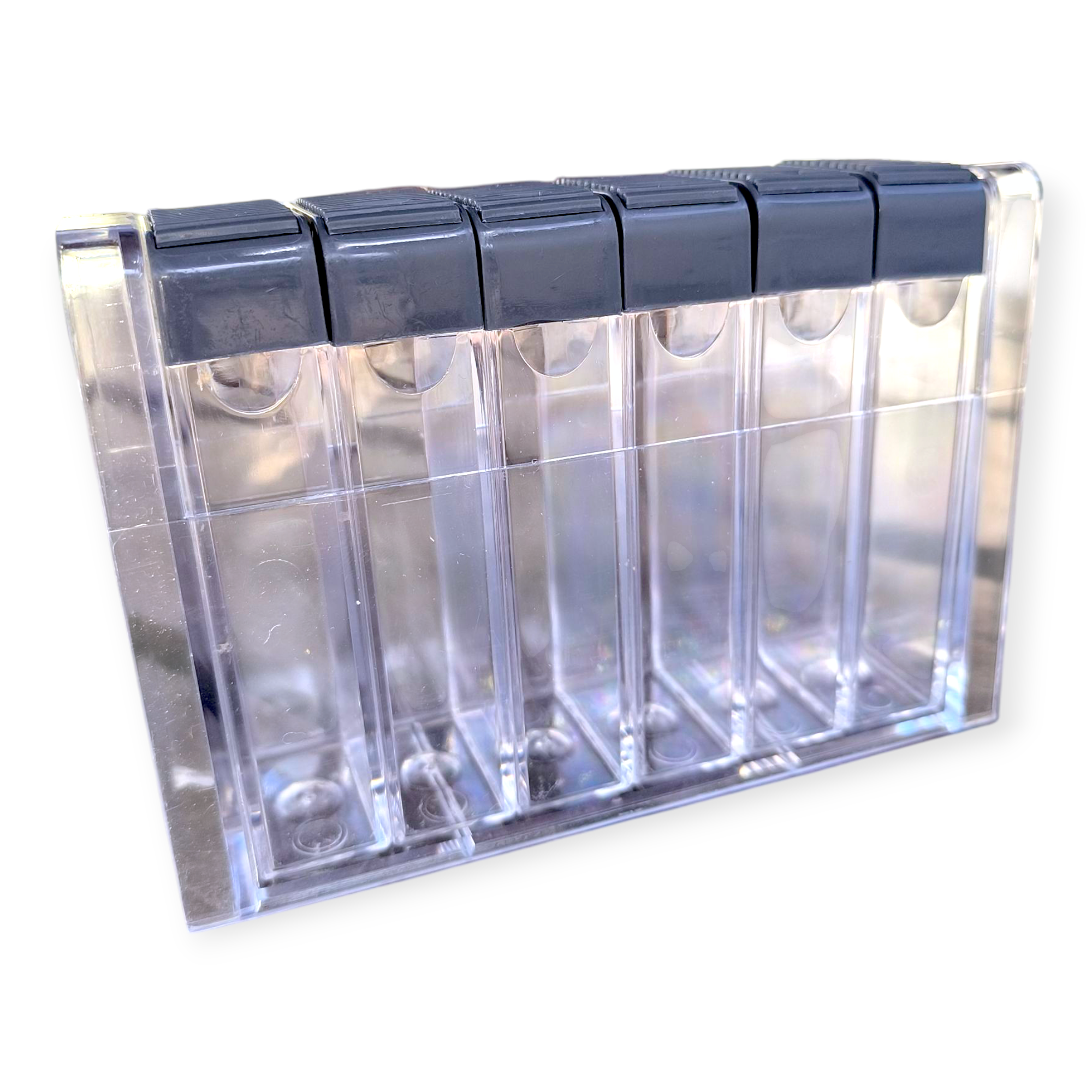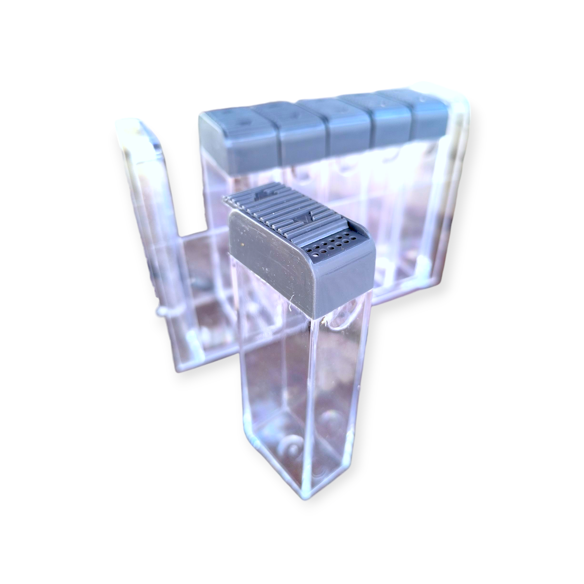 A tartályok egy átlátszó állványra vannak rögzítve, amely segít rendezetten és helytakarékosan tárolni őket.
