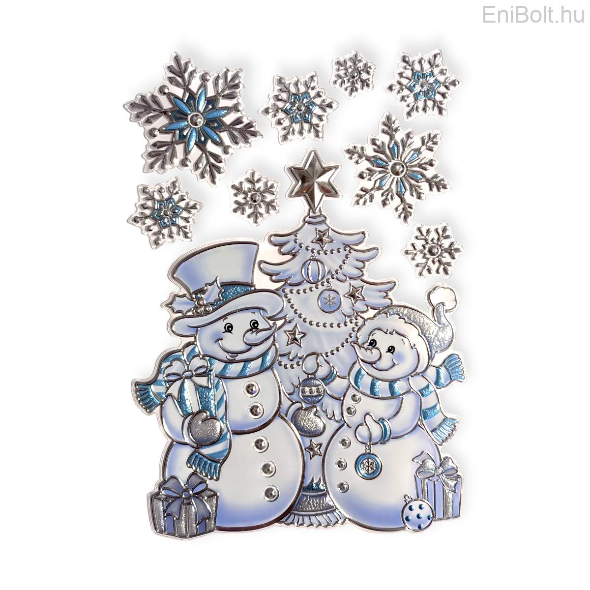 Dekoratív karácsonyi matrica hóemberrel, fenyőfával, hópelyhekkel és dombornyomott ajándékokkal kék-ezüst színekben. Elegáns, vidám kiegészítője ablaknak, falnak vagy tükörnek.
