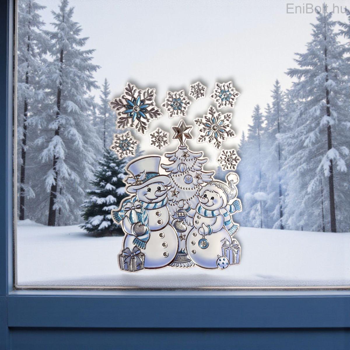 Kezdőlap » Karácsonyi dekorációk » Karácsonyi matricák » Hóemberes karácsonyi ablakmatrica – fenyő és kék-ezüst hópelyhek 21×31 cm