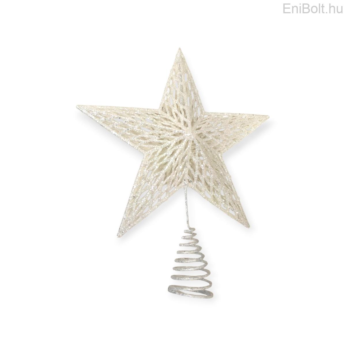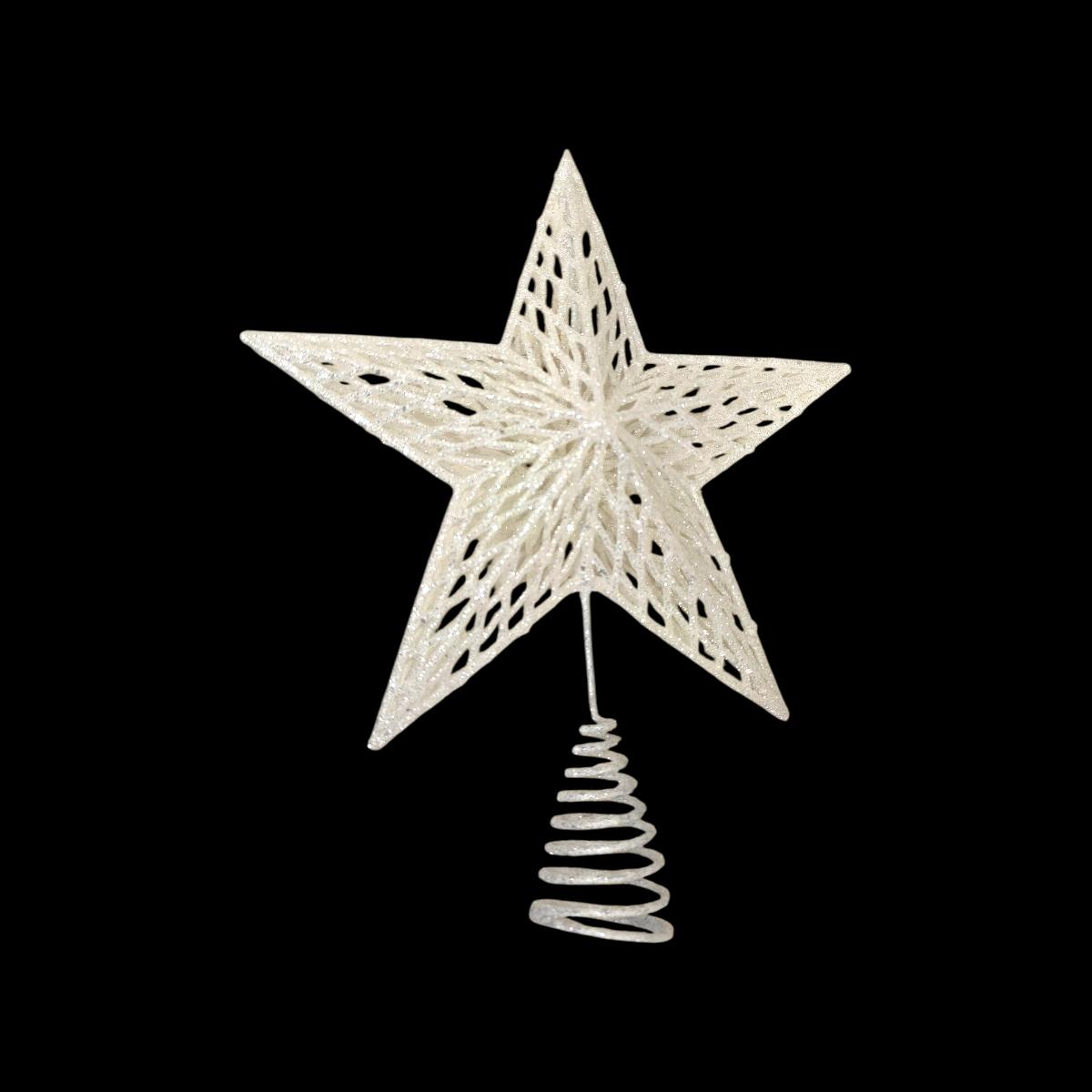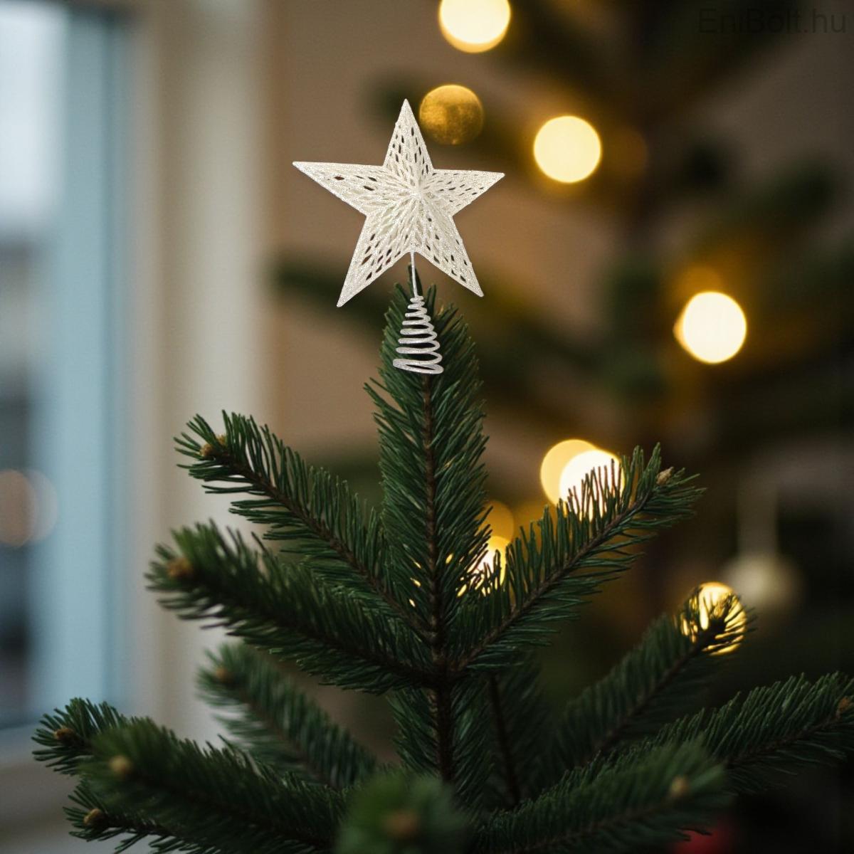 Ragyogó irizáló fehér 3D csillag csúcsdísz, amely csillámló felületével és részletes mintáival elegáns fényt visz a karácsonyfádra. A háromdimenziós kialakítás kiemeli a fa tetejét, miközben modern és ünnepi hangulatot teremt.