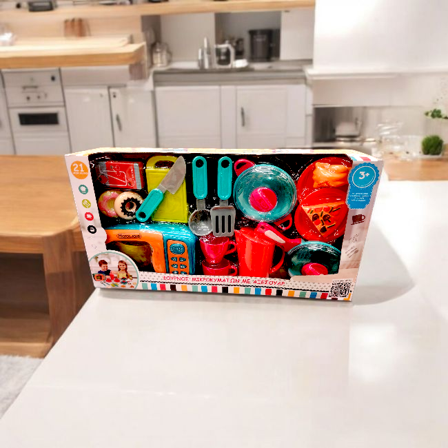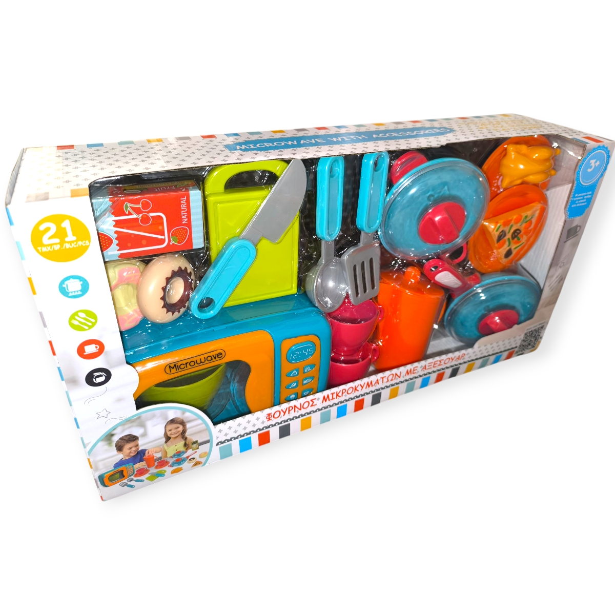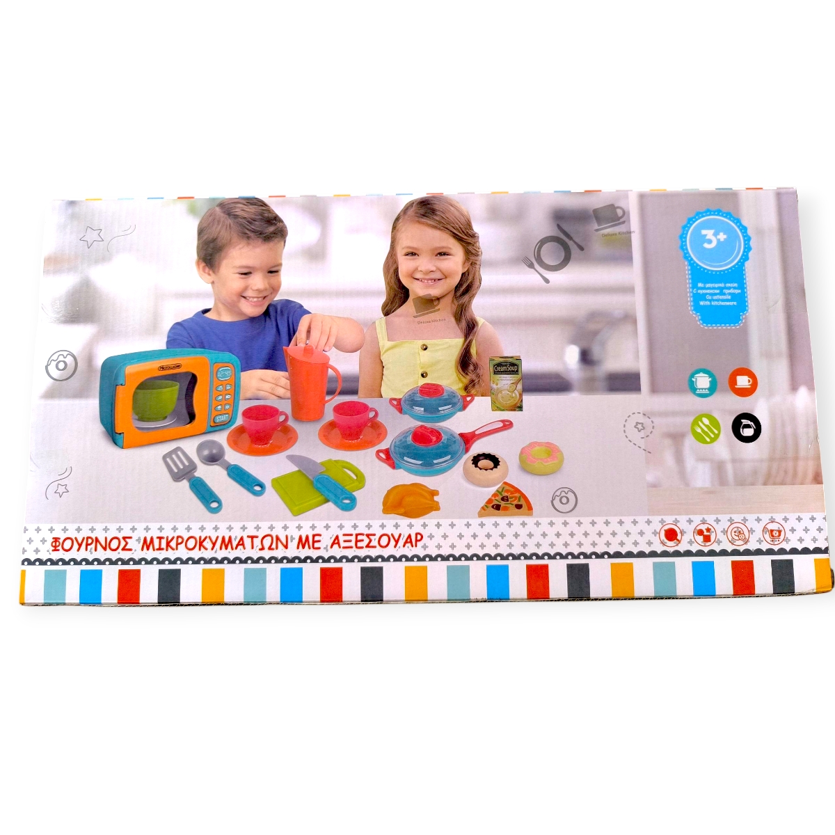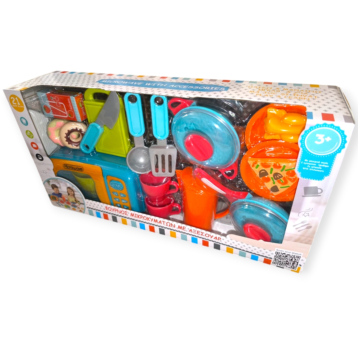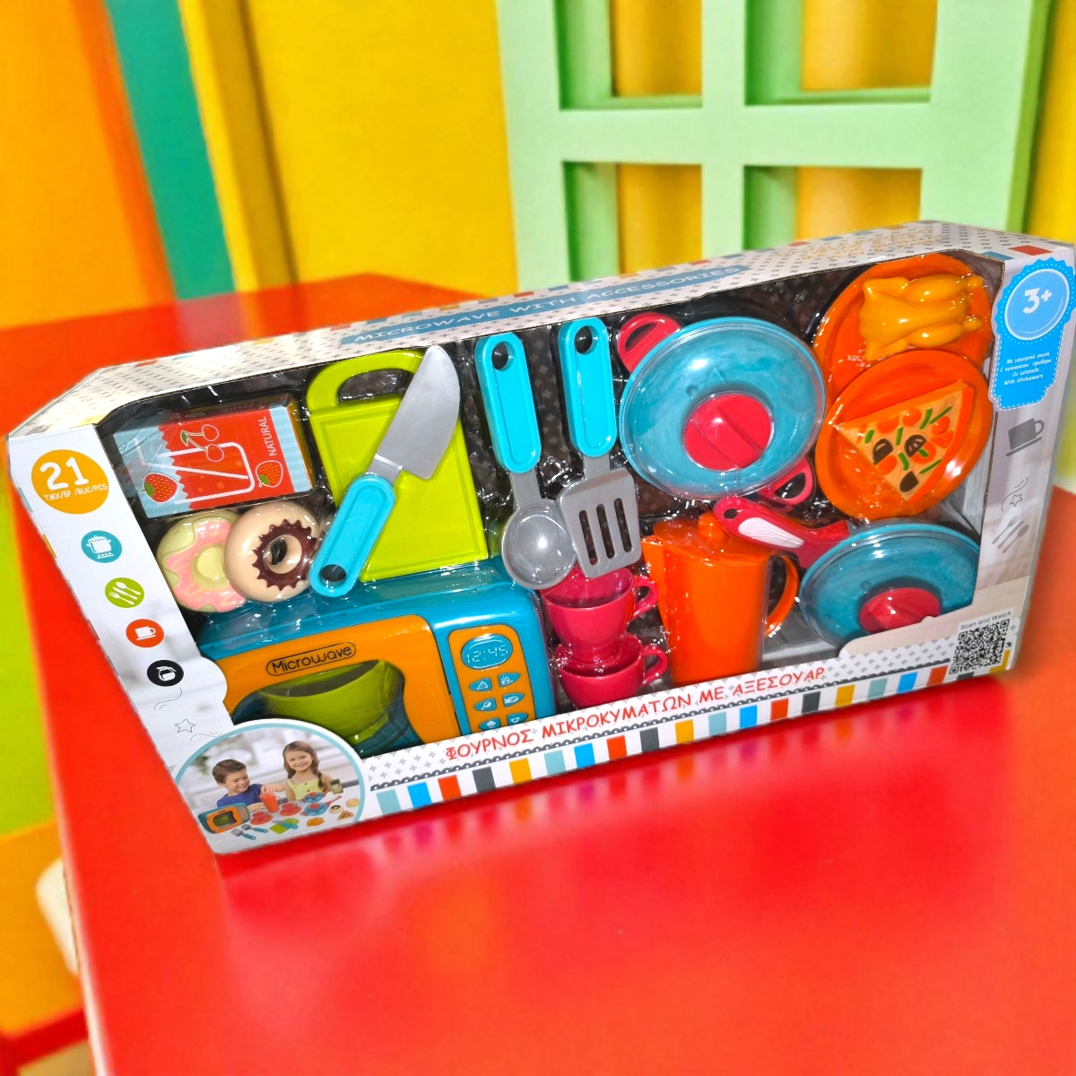 • Tartalom: Mikrohullámú játék sütő, főzőeszközök, játék ételek