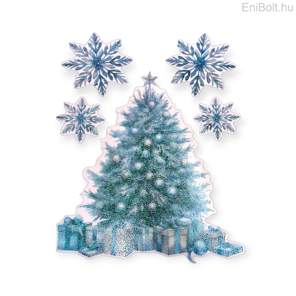 Karácsonyfa ajándékos karácsonyi matrica kék csillámmal 30x38cm