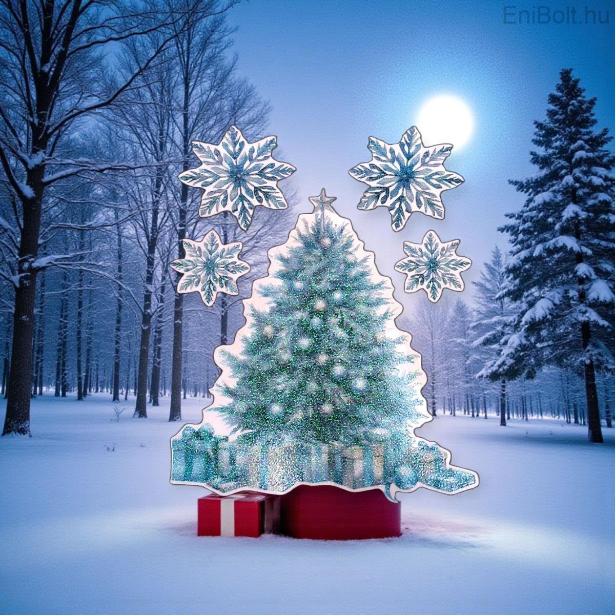 Dekoratív karácsonyi matrica karácsonyfával, ajándékokkal és hópelyhekkel, irizáló kék csillámmal díszítve.