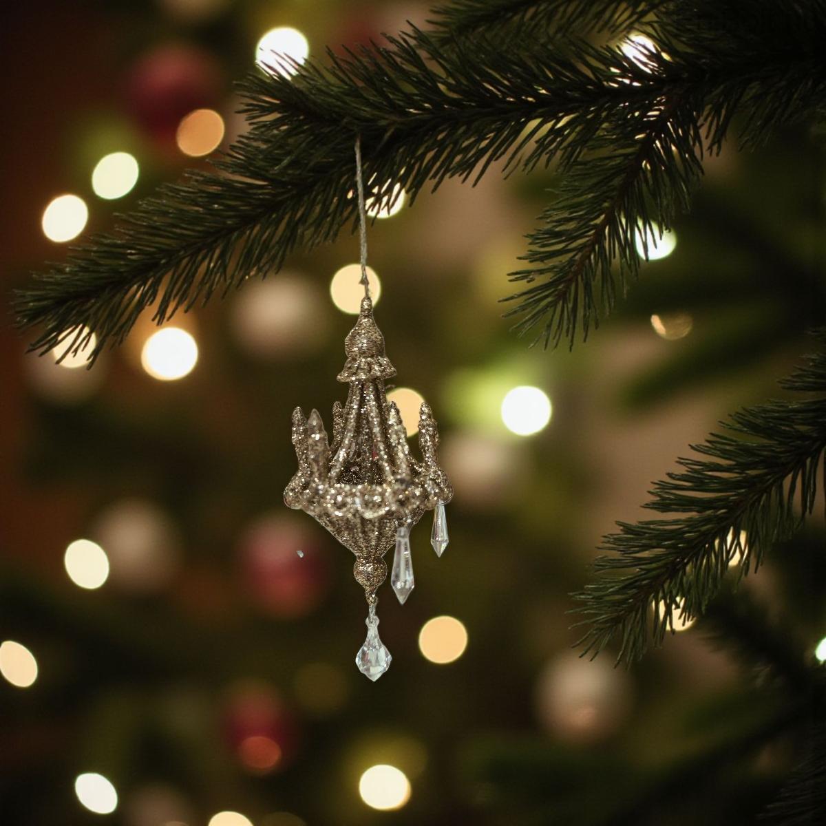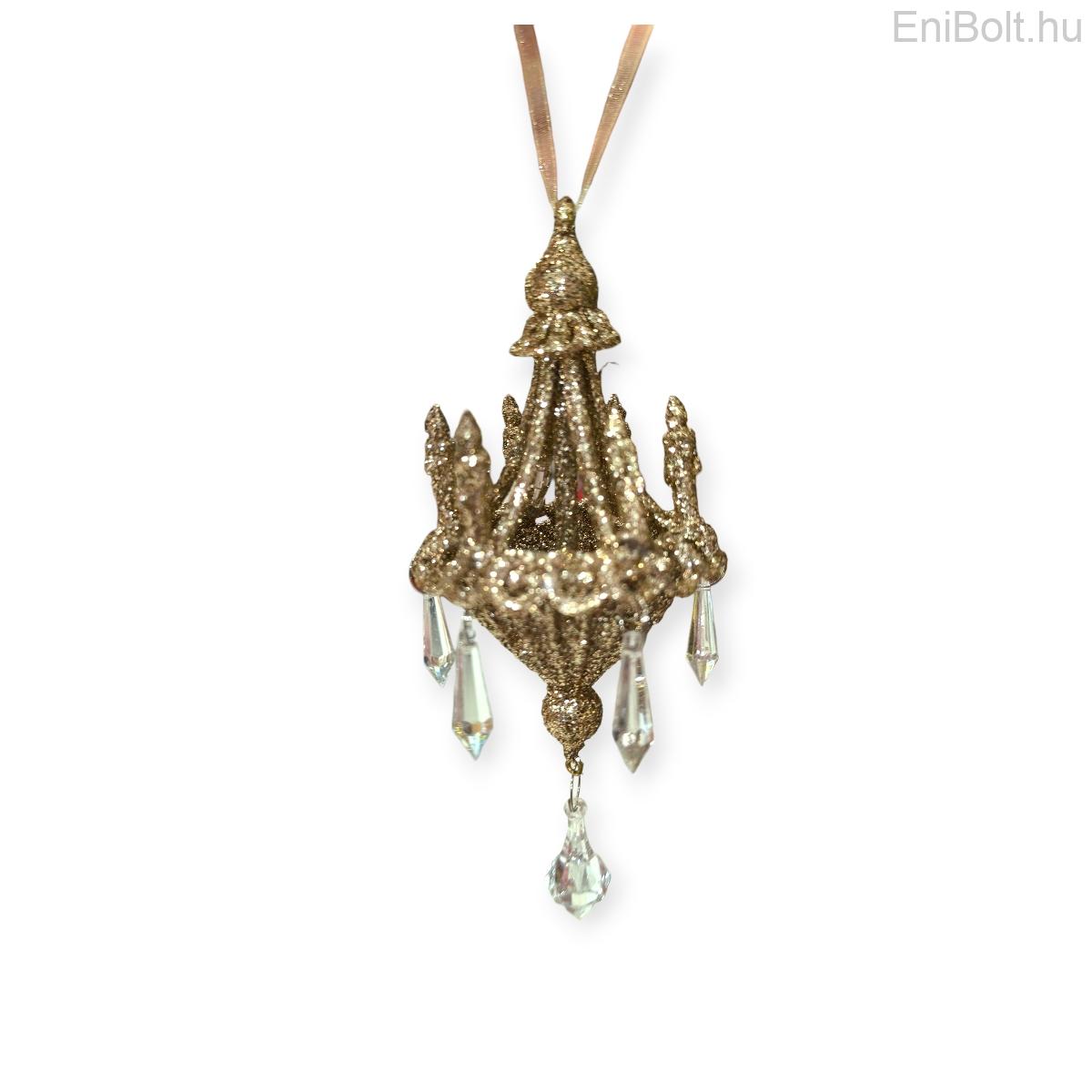 Varázslatos karácsonyfadísz csillár formában, pezsgő csillogással és kristályokkal, amely eleganciát és fényt hoz otthonába.