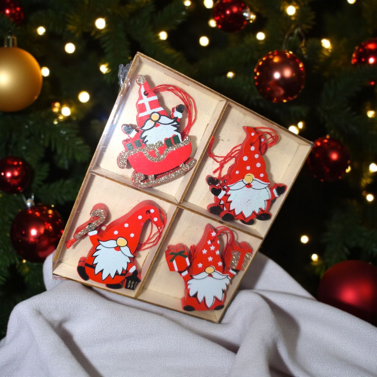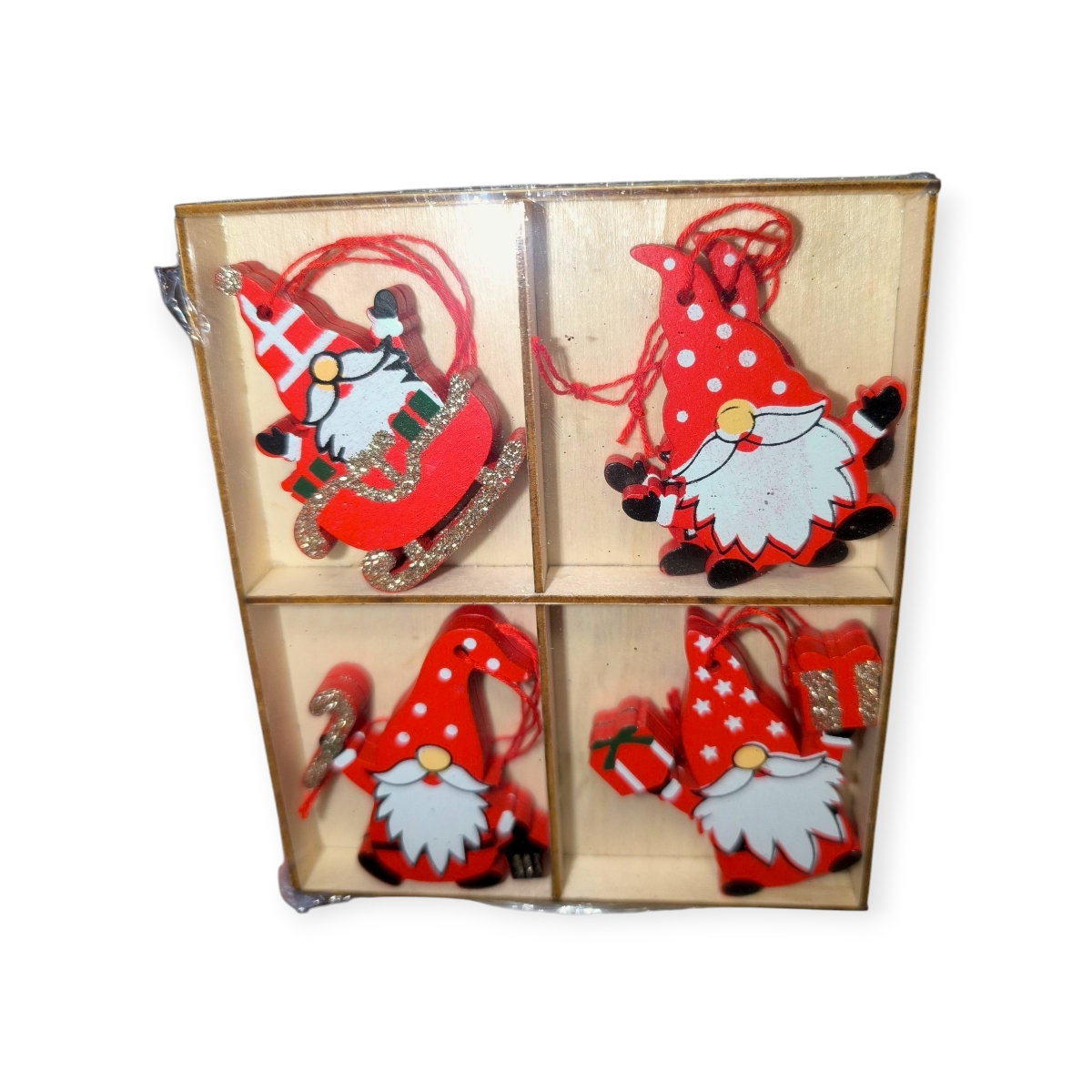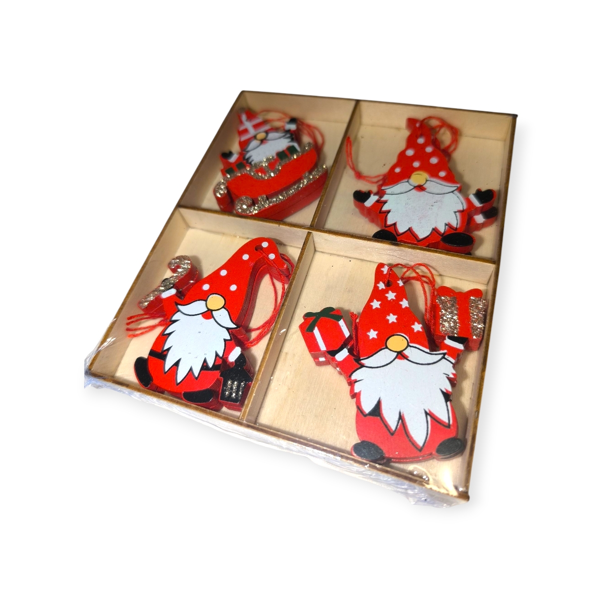 Fából készült vörös Mikulás gnóm karácsonyfadísz szett – 8 darab