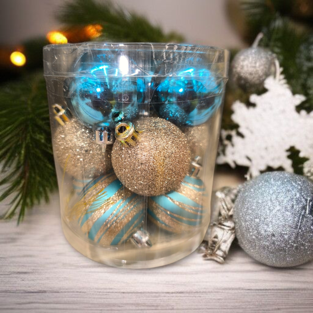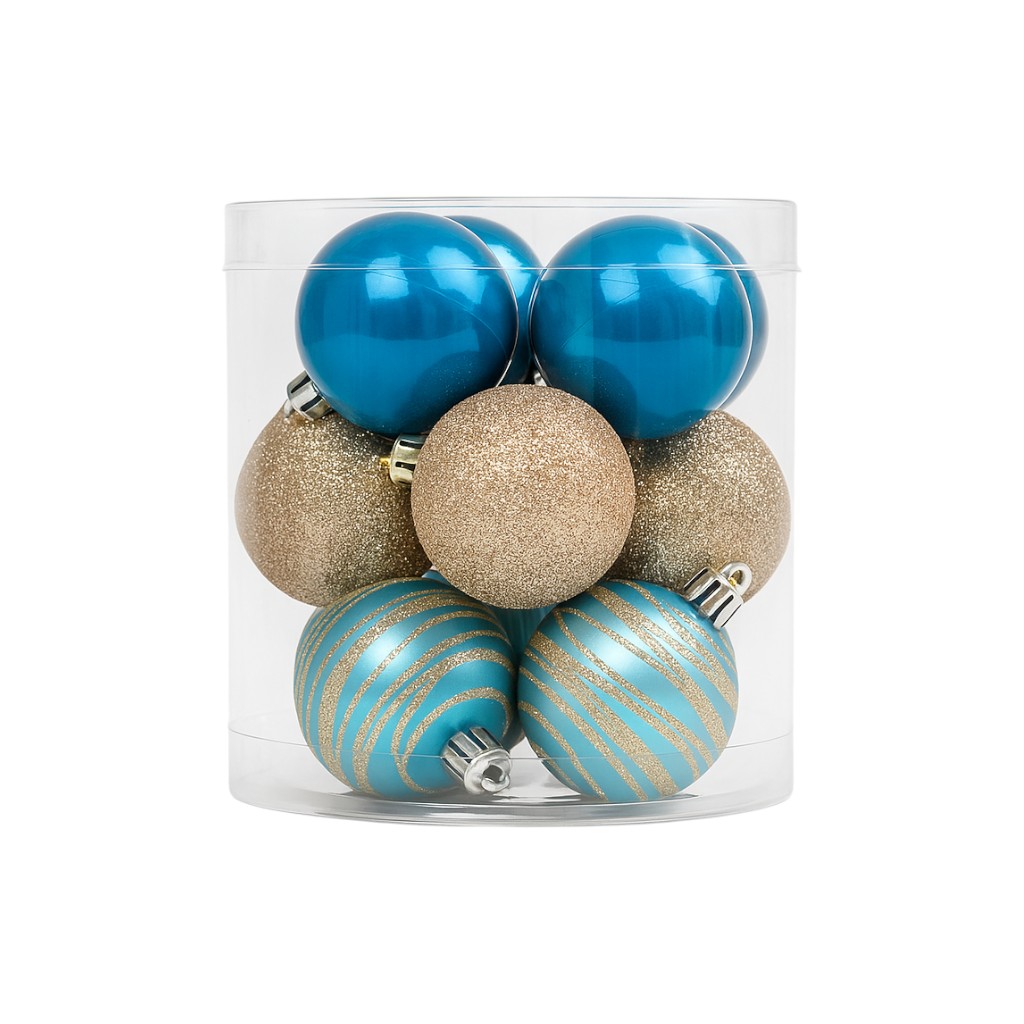 Elegáns karácsonyi gömbdíszek türkiz és pezsgő színekben, matt és fényes felülettel, csillogó csíkozással. A 12 darabos szett tökéletes választás a fa dekorálásához, modern és varázslatos hangulatot teremtve.