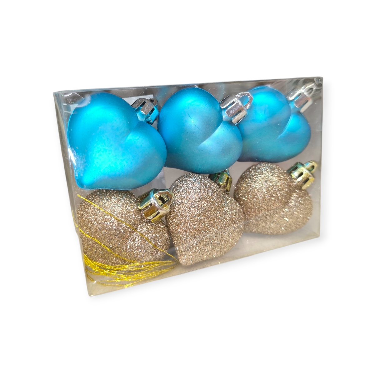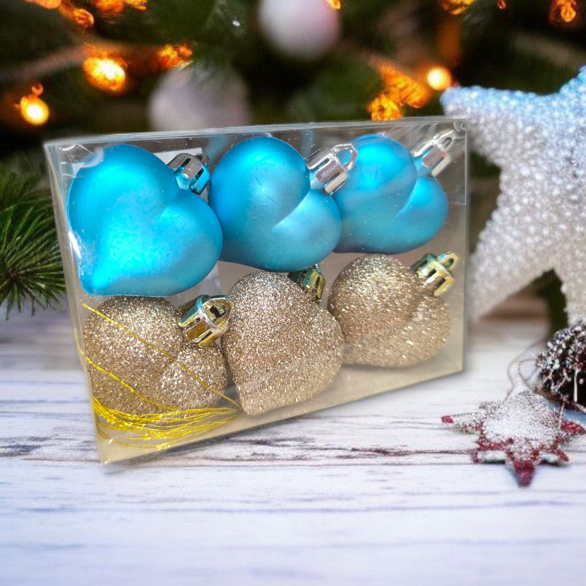 Romantikus és elegáns karácsonyi szívdíszek türkiz és pezsgő színekben, matt és fényes felülettel. A 6 darabos szett különleges kiegészítője a karácsonyfának, modern és ünnepi hangulatot teremt.