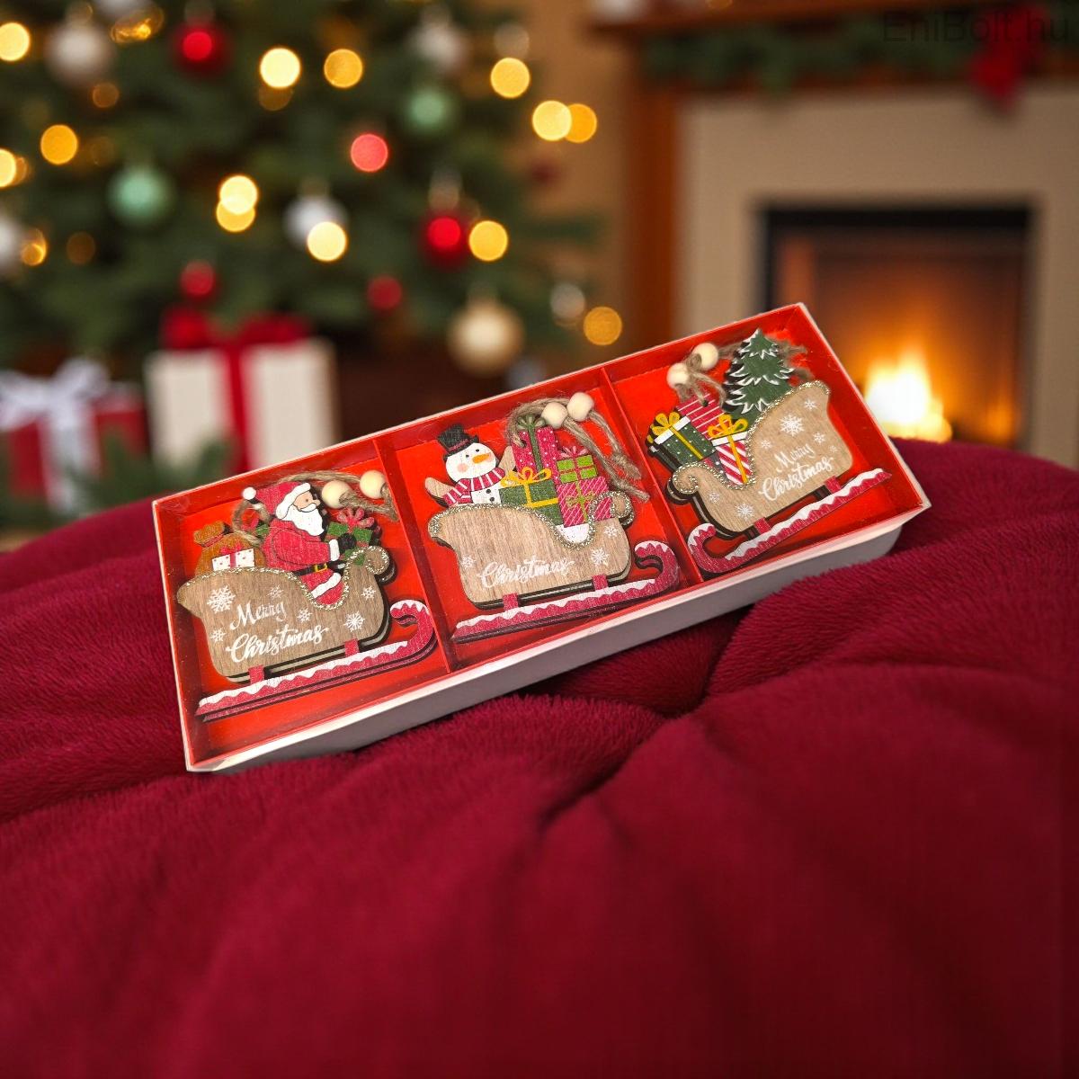 A szettben Mikulás, hóember és ajándék mintás díszek találhatók, amelyek vidámságot és melegséget visznek az ünnepi dekorációba.