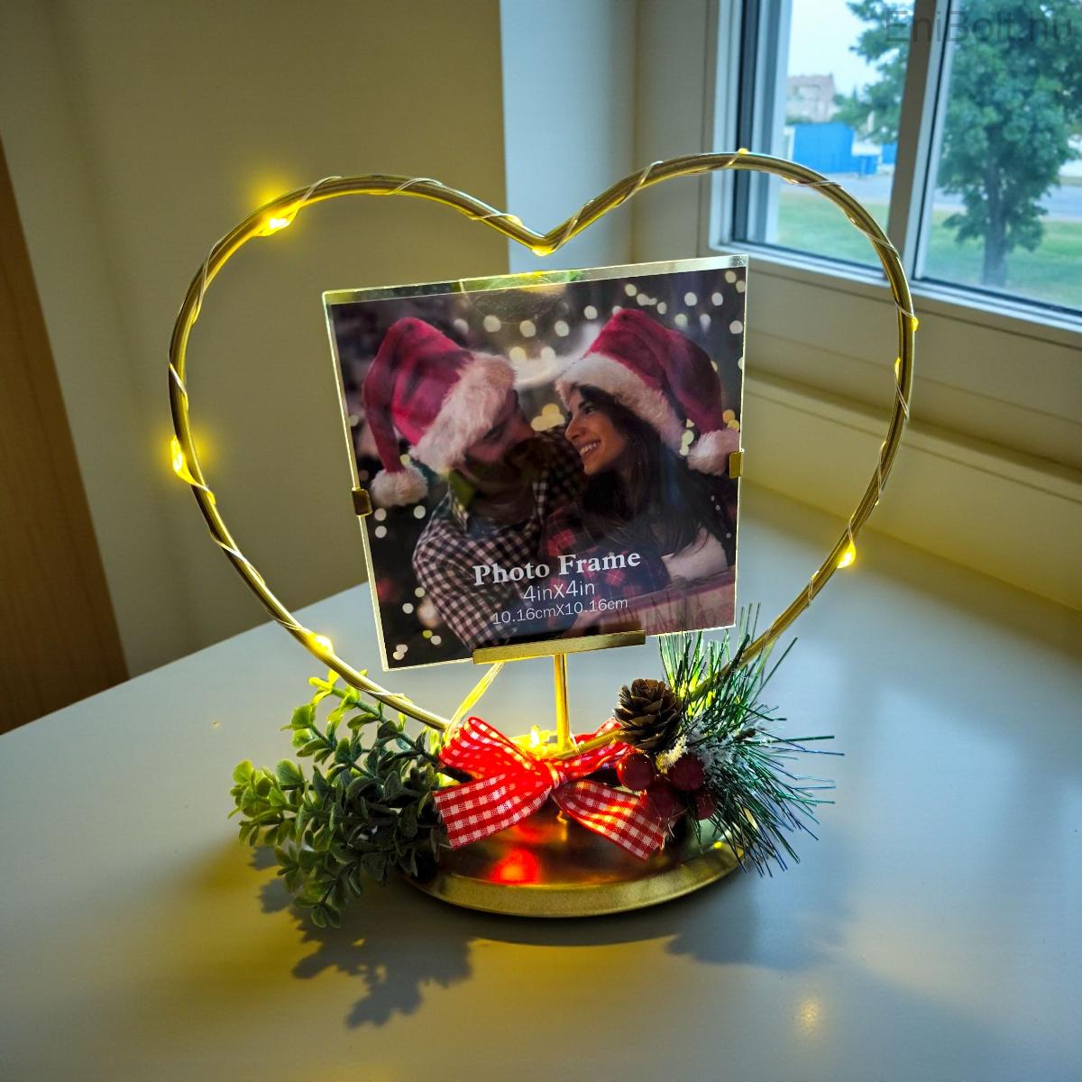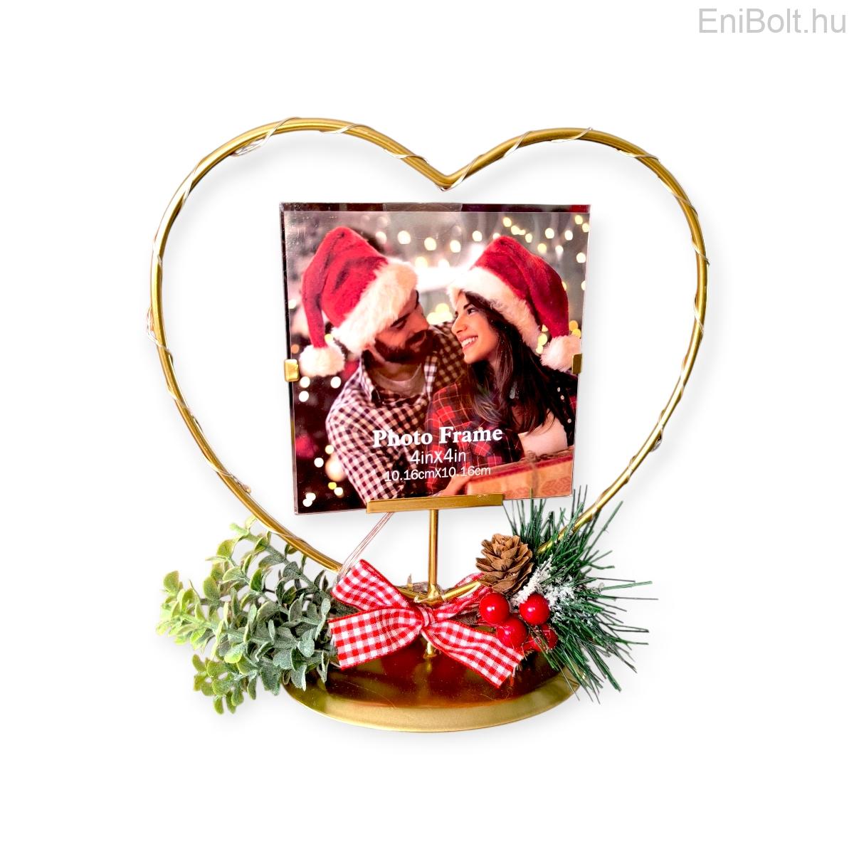 Hangulatos karácsonyi képkeret arany szívformával és meleg LED-fénnyel. Az alján fenyőtobozok, piros bogyók, pompomok és kockás szalag díszítik, így egyedi, ünnepi hangulatot teremt.