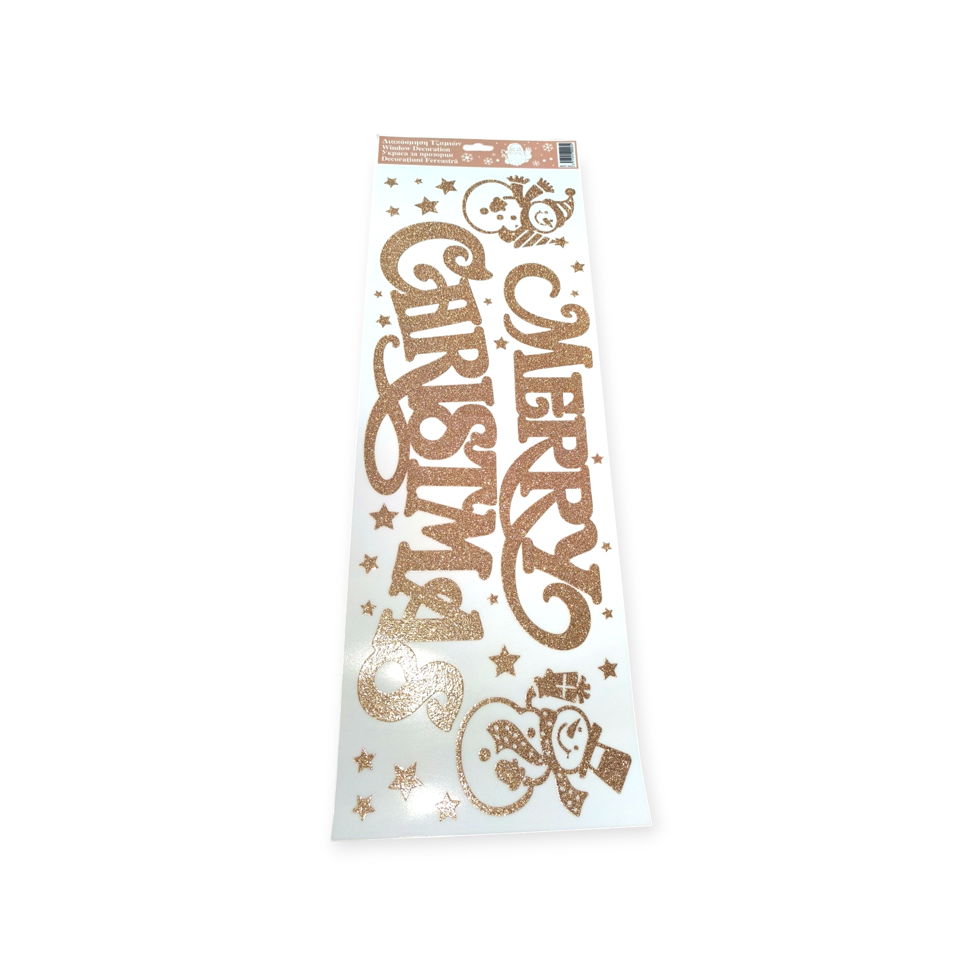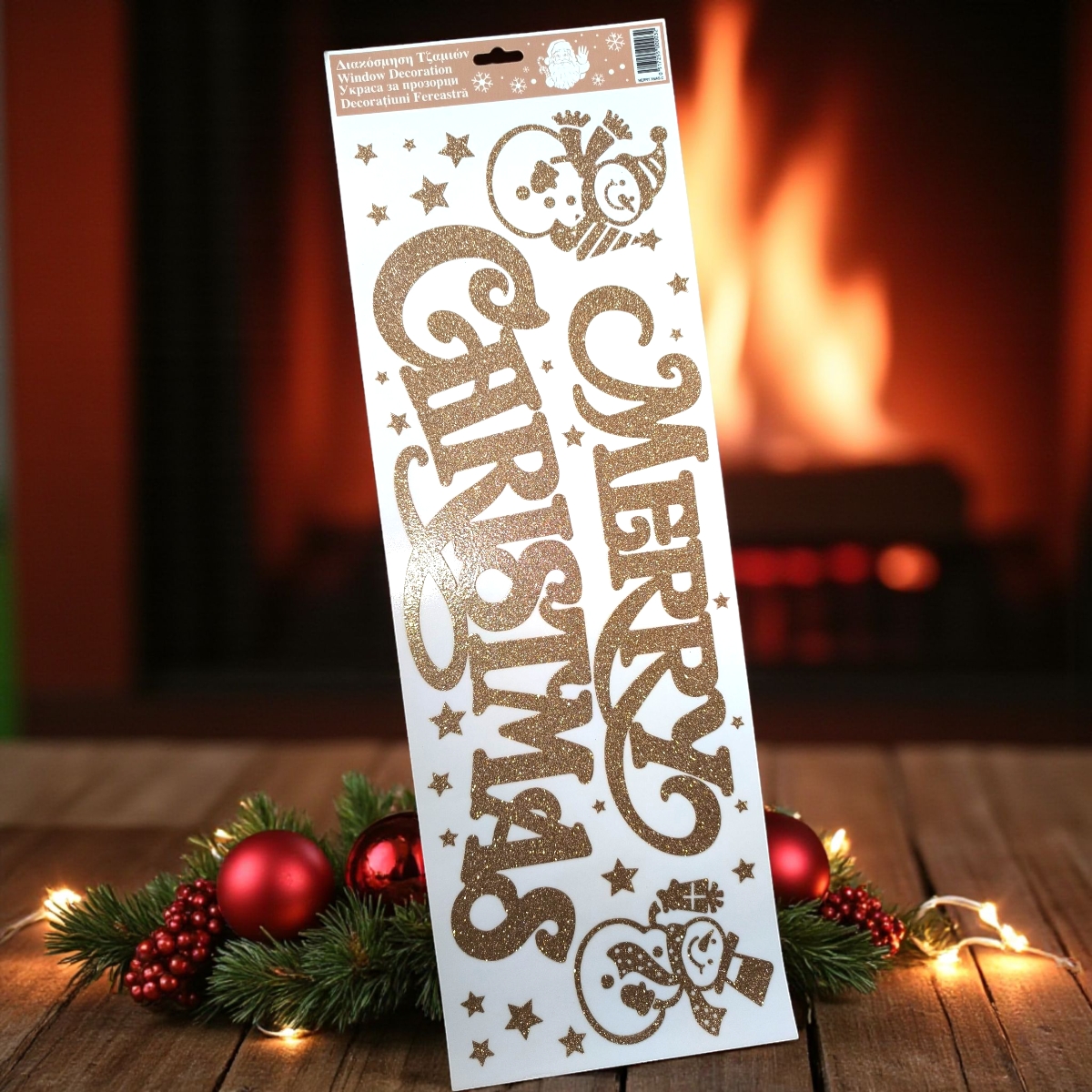 Kezdőlap » Karácsonyi dekorációk » Karácsonyi matricák » Karácsonyi ablakmatrica – Bronz csillogó Merry Christmas hóember 20x60cm