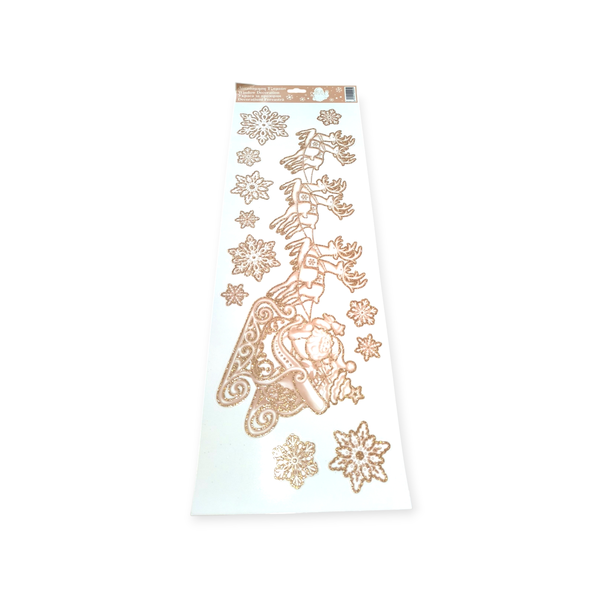 Kezdőlap » Karácsonyi dekorációk » Karácsonyi matricák » Karácsonyi ablakmatrica – Bronz csillogó rénszarvas szánnal és hópelyhekkel 20x60cm