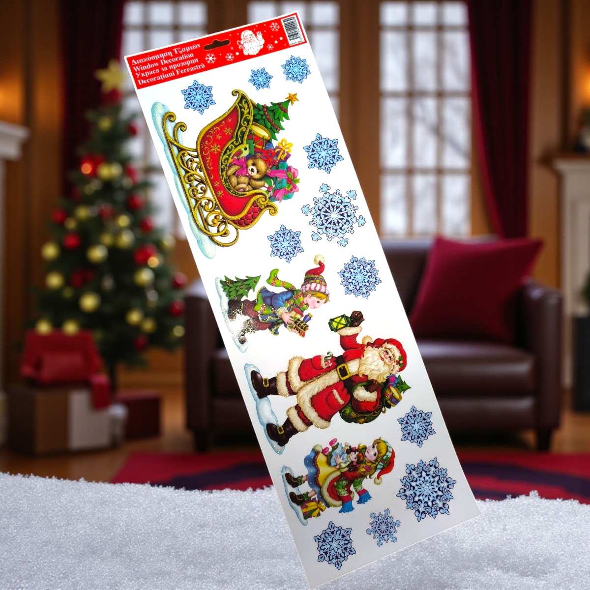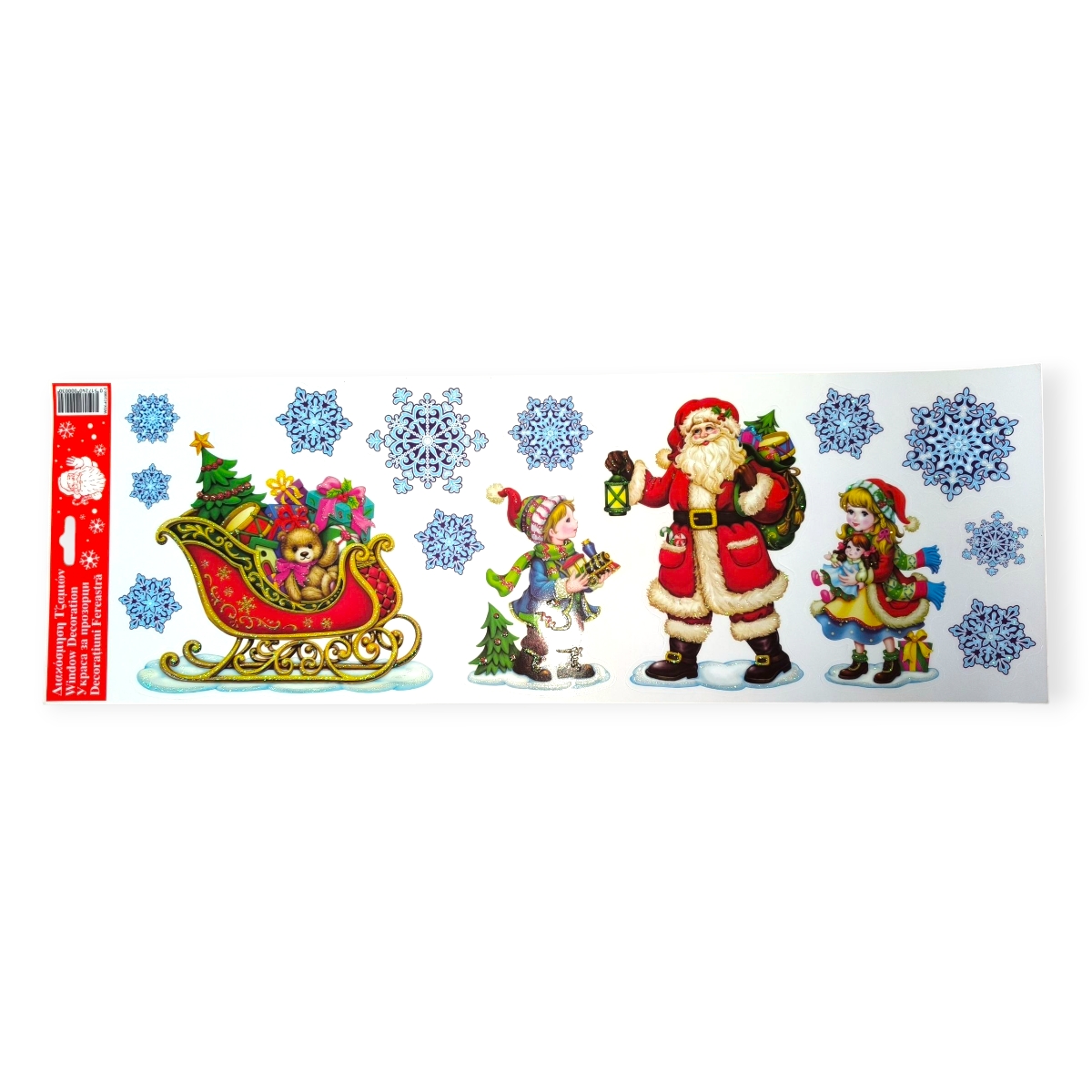 Kezdőlap » Karácsonyi dekorációk » Karácsonyi matricák » Karácsonyi ablakmatrica – Mikulás gyerekekkel, szánnal és hópelyhekkel 21x60cm