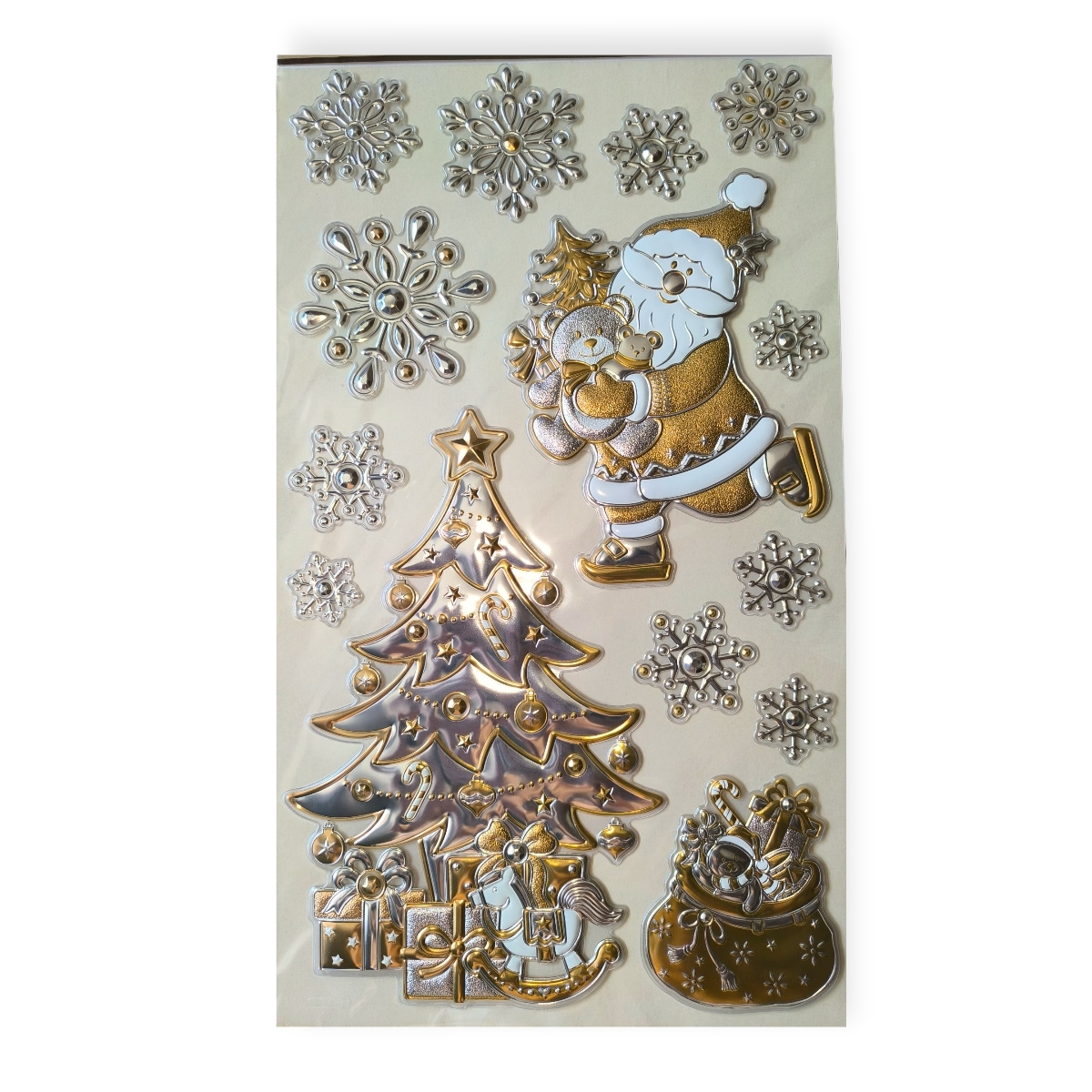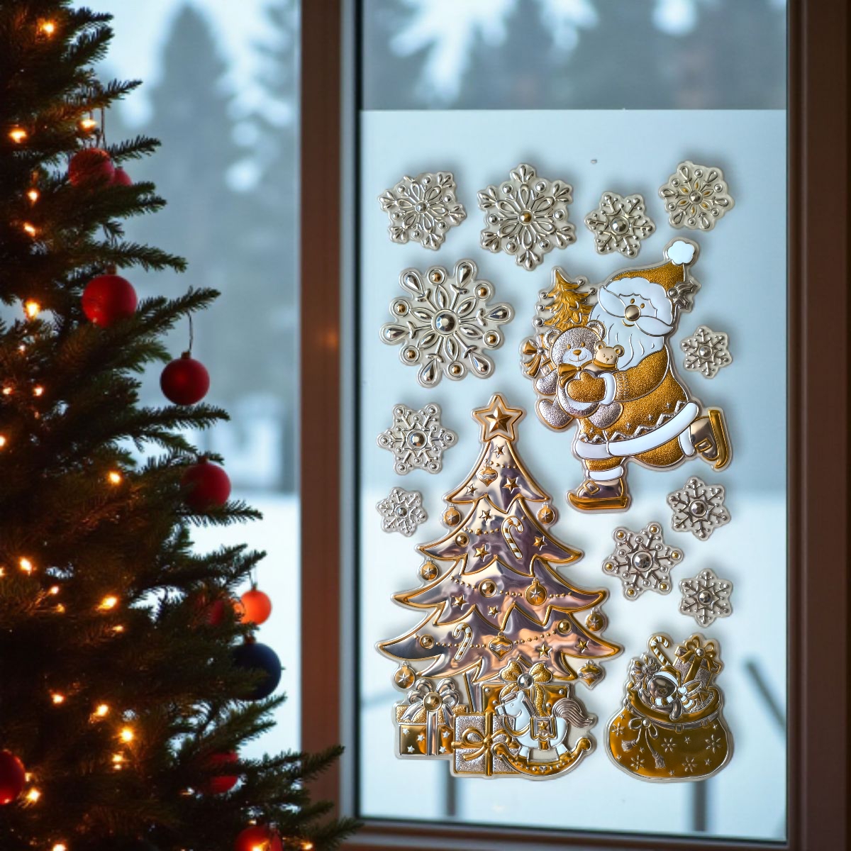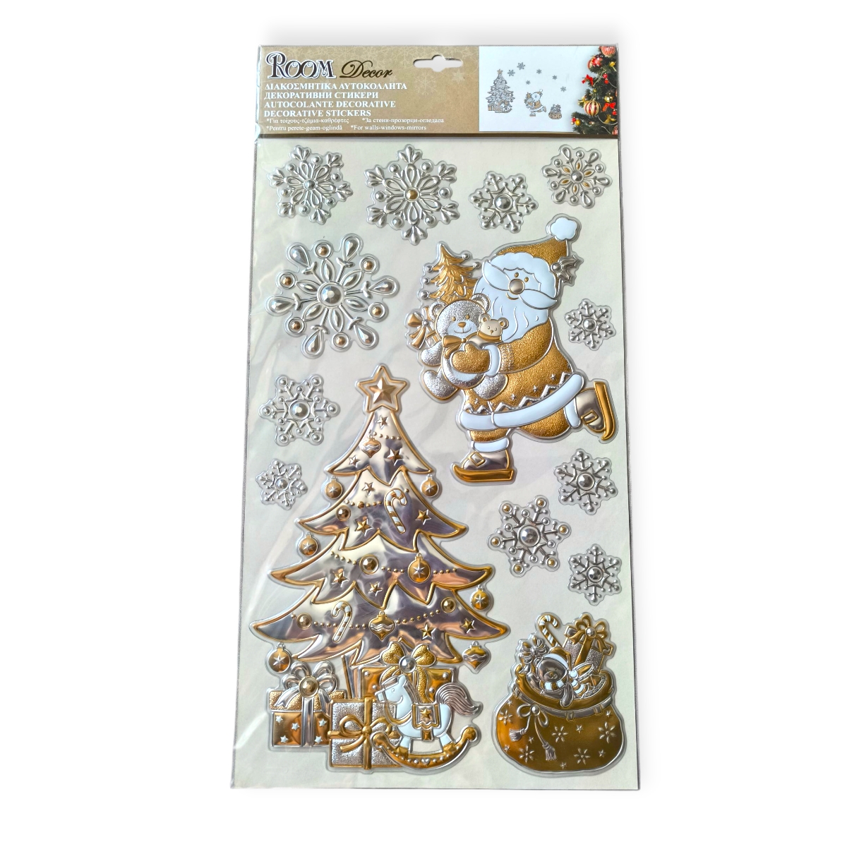 Dobd fel otthonodat ezzel a bézs–pezsgő árnyalatú karácsonyi matricával, amely Mikulást, karácsonyfát, ajándékos táskát és ezüst hópelyheket ábrázol. Ideális választás ablakok, tükrök vagy falak ünnepi díszítésére.