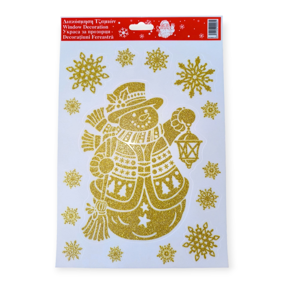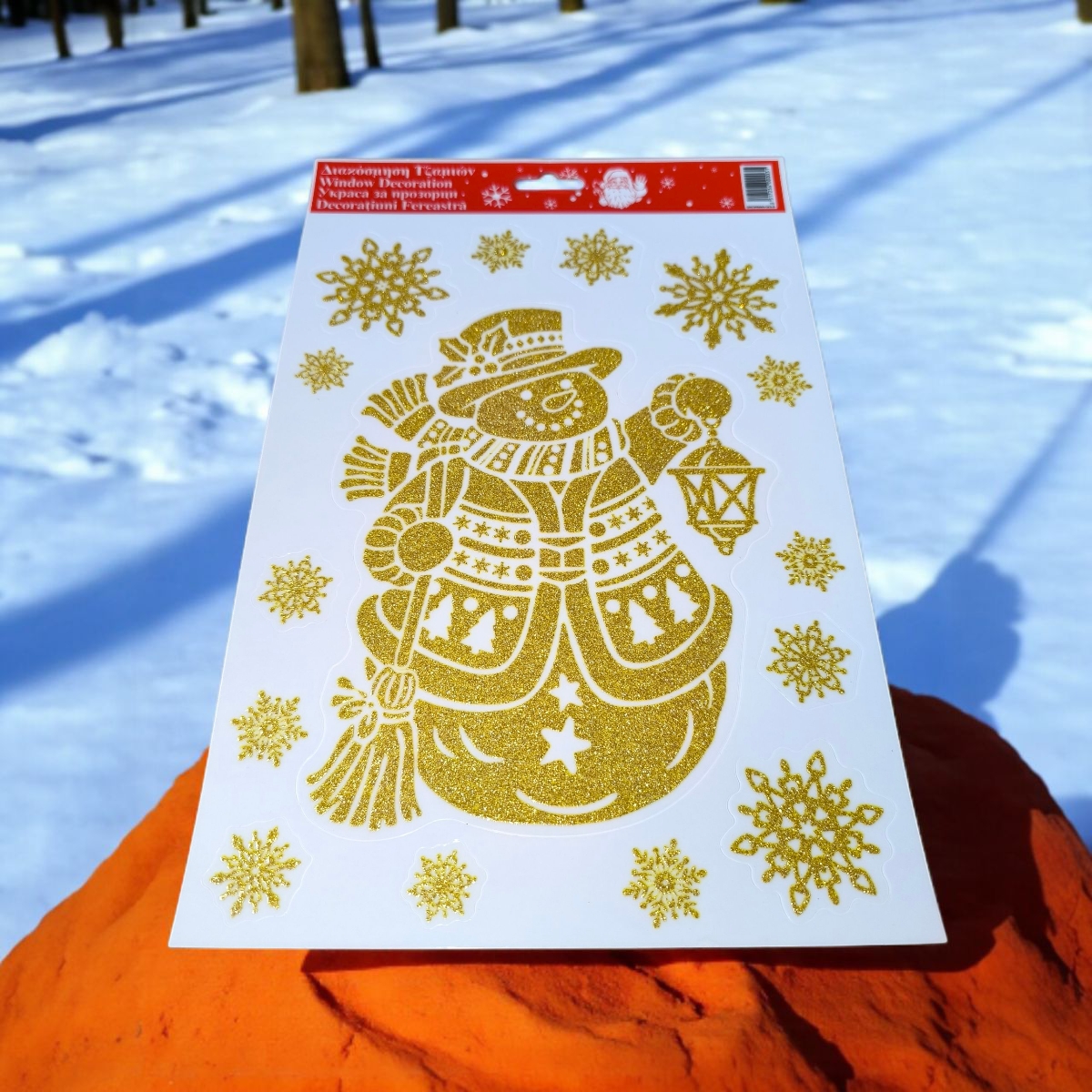Varázsold meghitté otthonod ezzel a dekoratív karácsonyi matricával, amely arany csillogású hóembert és hópelyheket ábrázol. Elegáns és vidám díszítés, amely ablakon, tükrön vagy üvegfelületen azonnal ünnepi hangulatot teremt.
