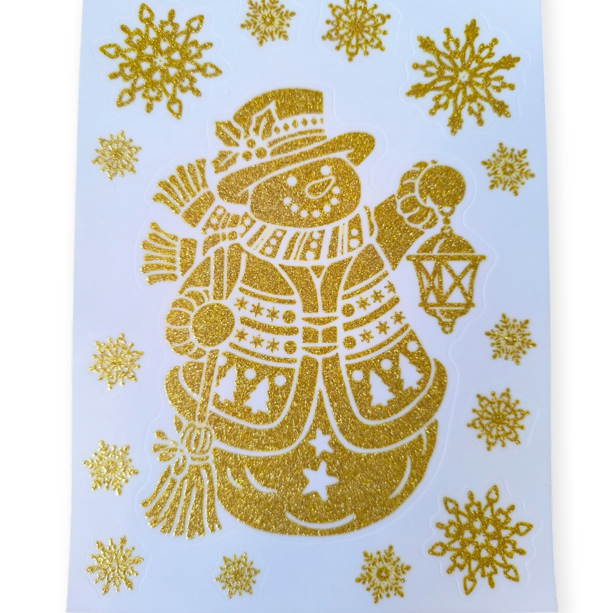 Kezdőlap » Karácsonyi dekorációk » Karácsonyi matricák » Karácsonyi ablakmatrica arany csillogó hóember hópelyhek 20×30 cm