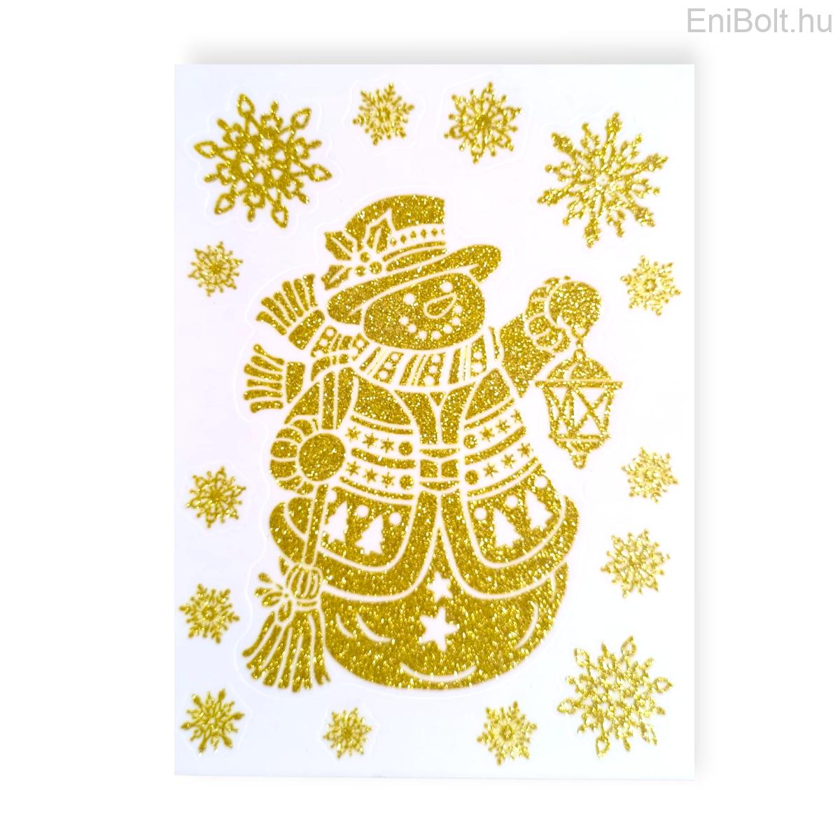 Kezdőlap » Karácsonyi dekorációk » Karácsonyi matricák » Karácsonyi ablakmatrica arany hóember és hópelyhek mintával – csillogó 20×30 cm