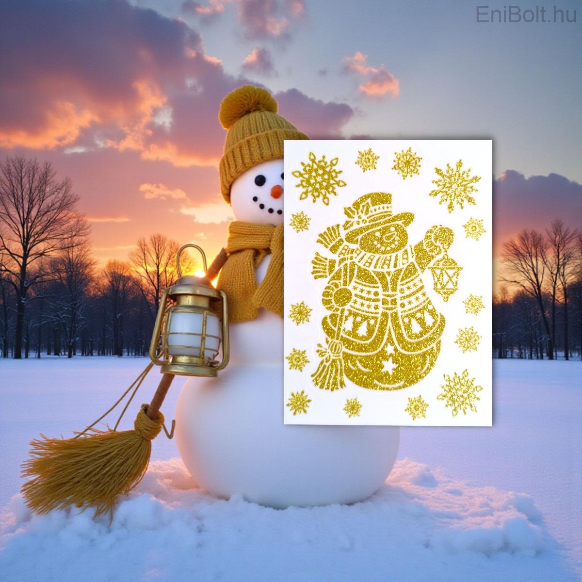 Varázsold meghitté otthonod ezzel a dekoratív karácsonyi matricával, amely arany csillogású hóembert és hópelyheket ábrázol. Elegáns és vidám díszítés, amely ablakon, tükrön vagy üvegfelületen azonnal ünnepi hangulatot teremt.