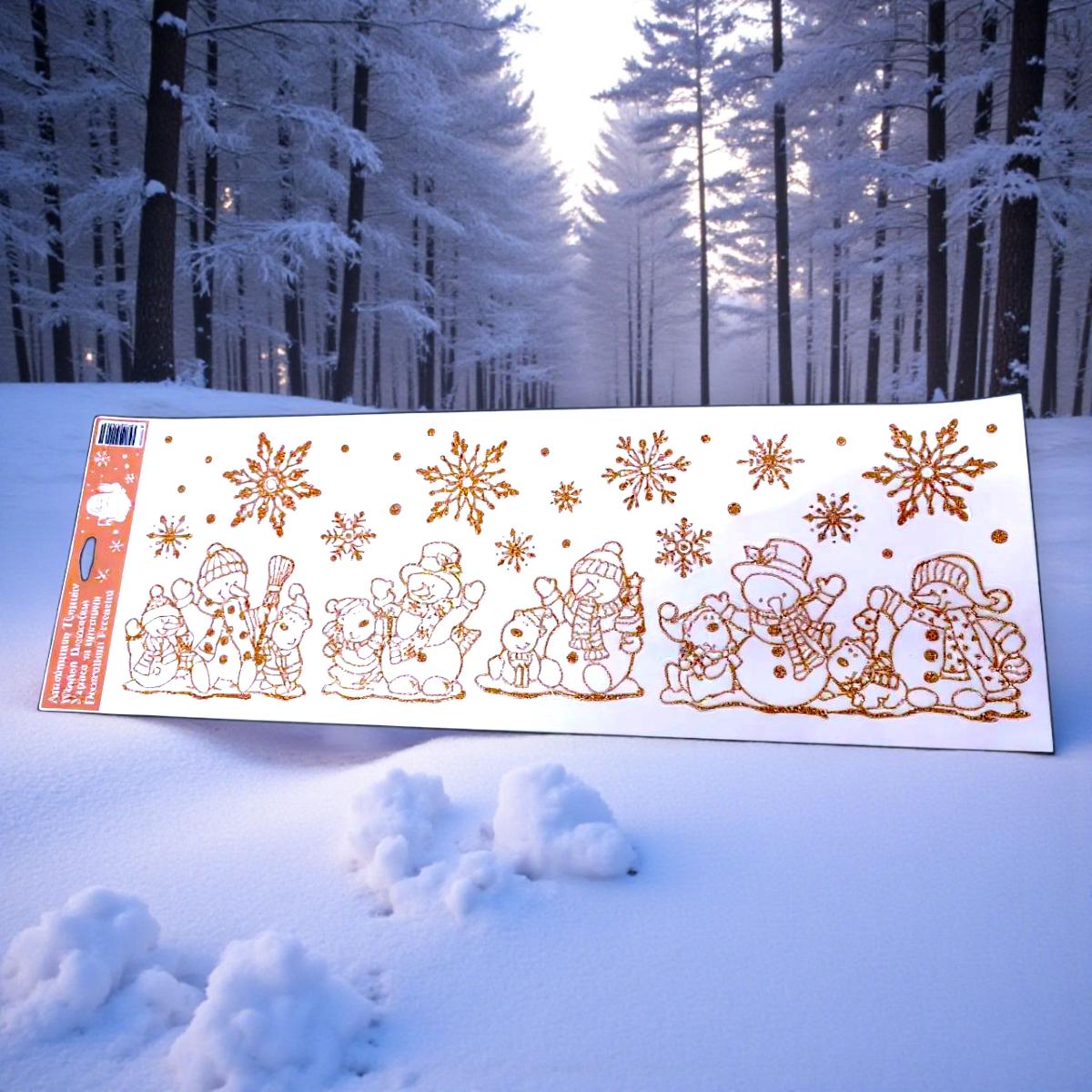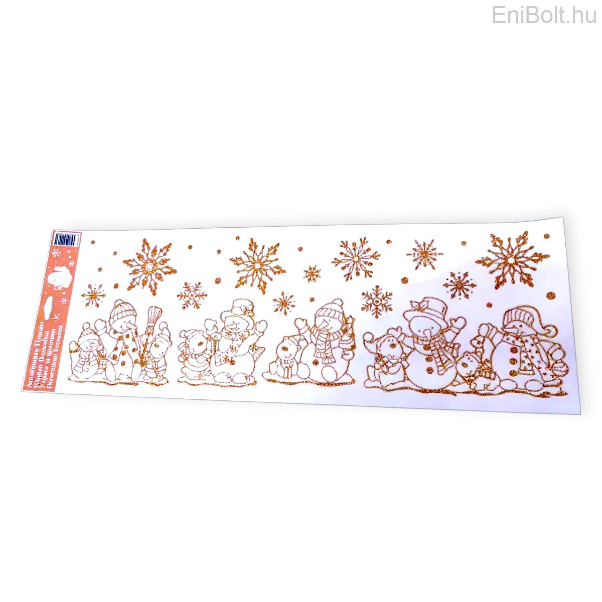 Karácsonyi ablakmatrica hóember és hópelyhek bronz csillámmal 20x60cm