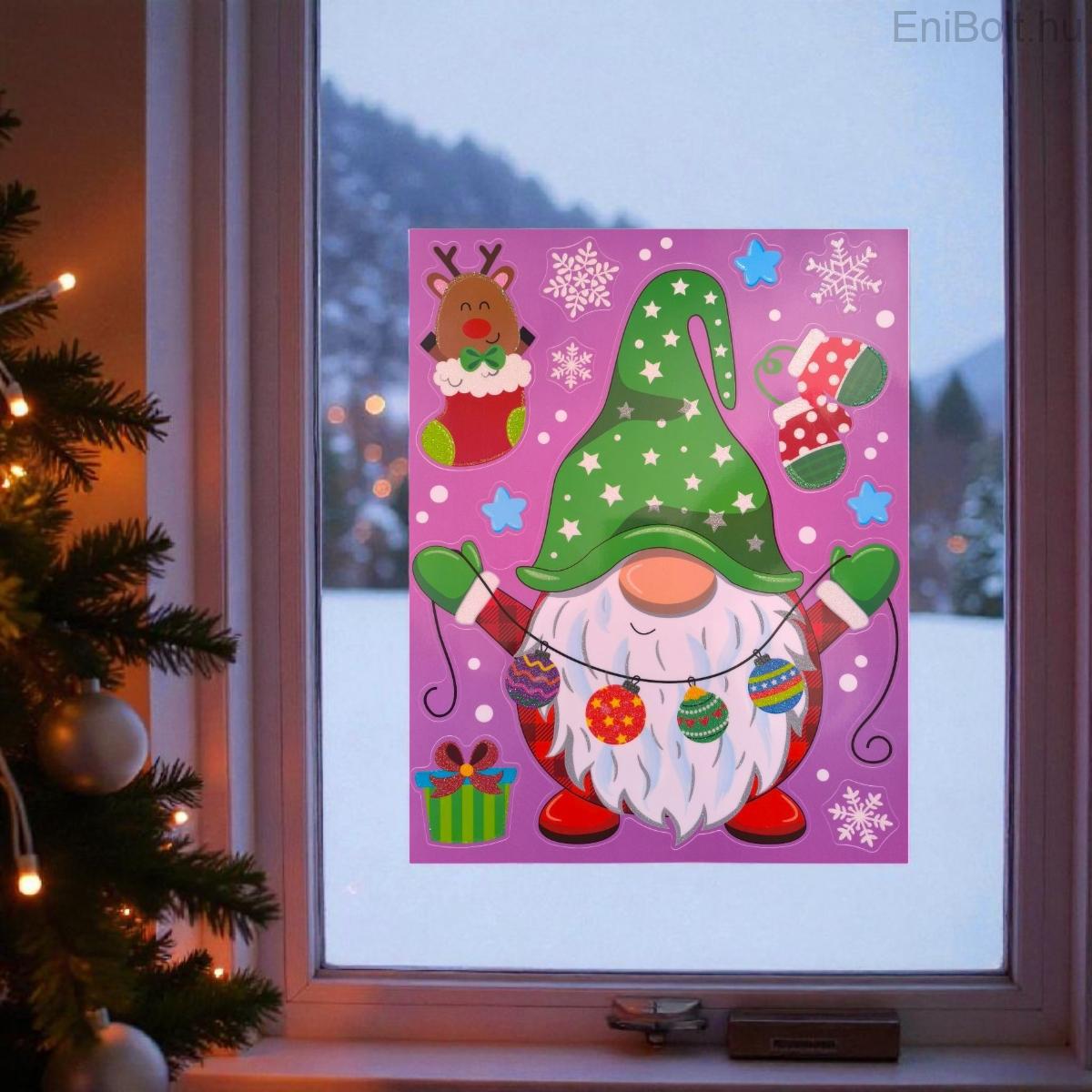 Dobd fel otthonod ünnepi hangulatát ezzel a karácsonyi ablakmatricával, amely vidám manó mintával és ünnepi díszekkel varázsol mosolyt kicsiknek és nagyoknak egyaránt.
