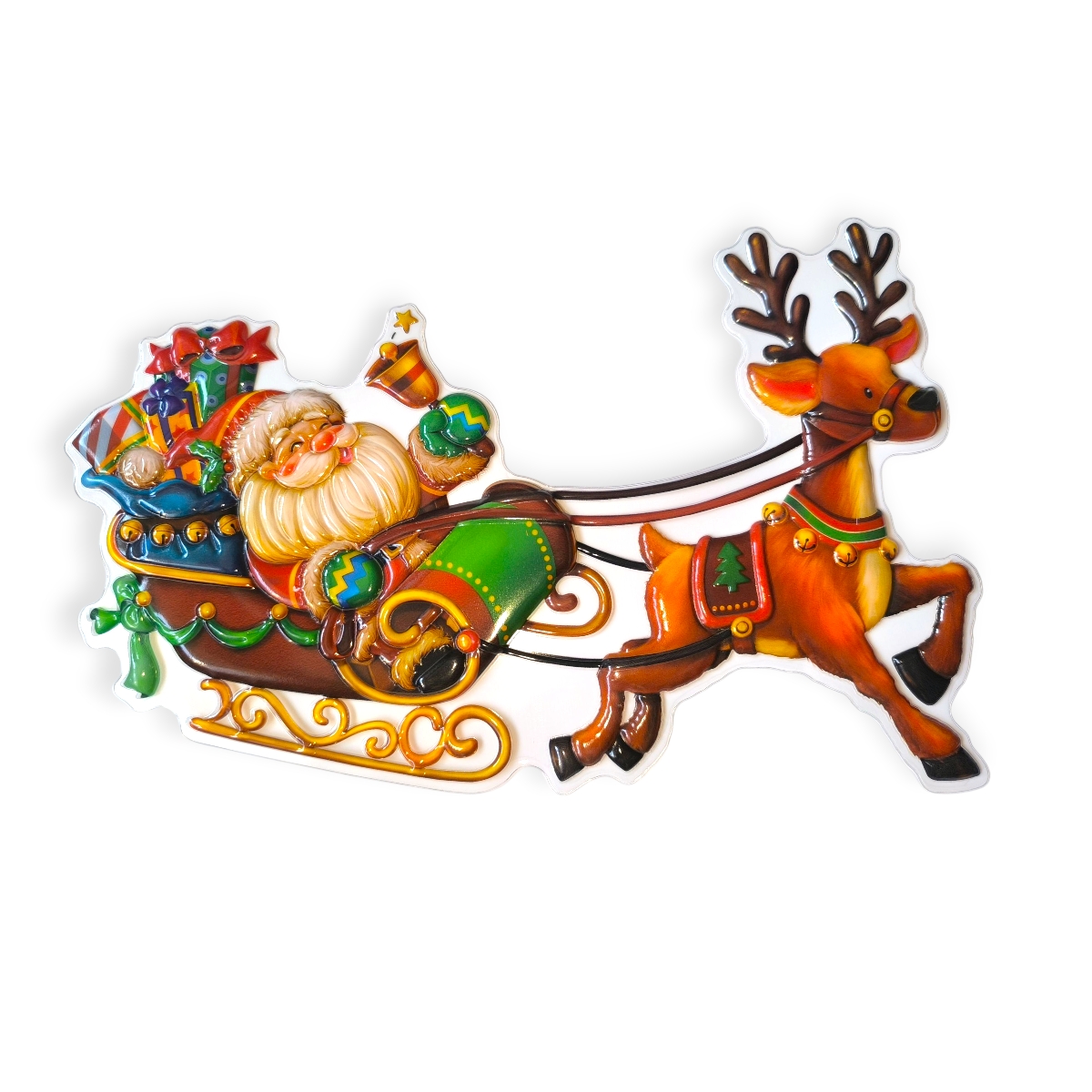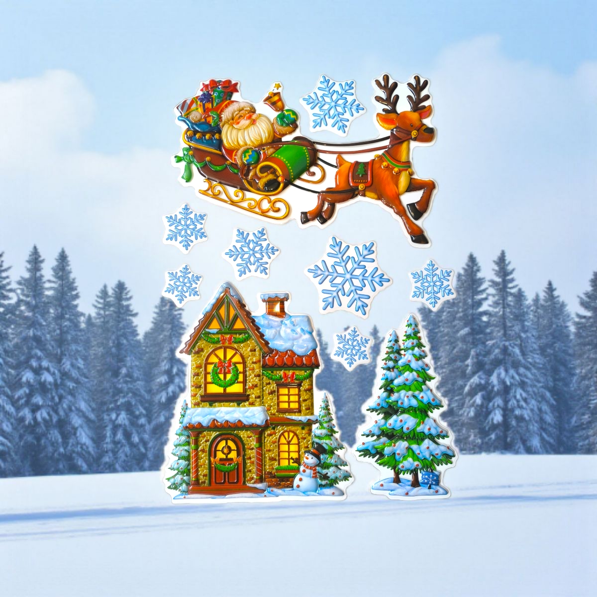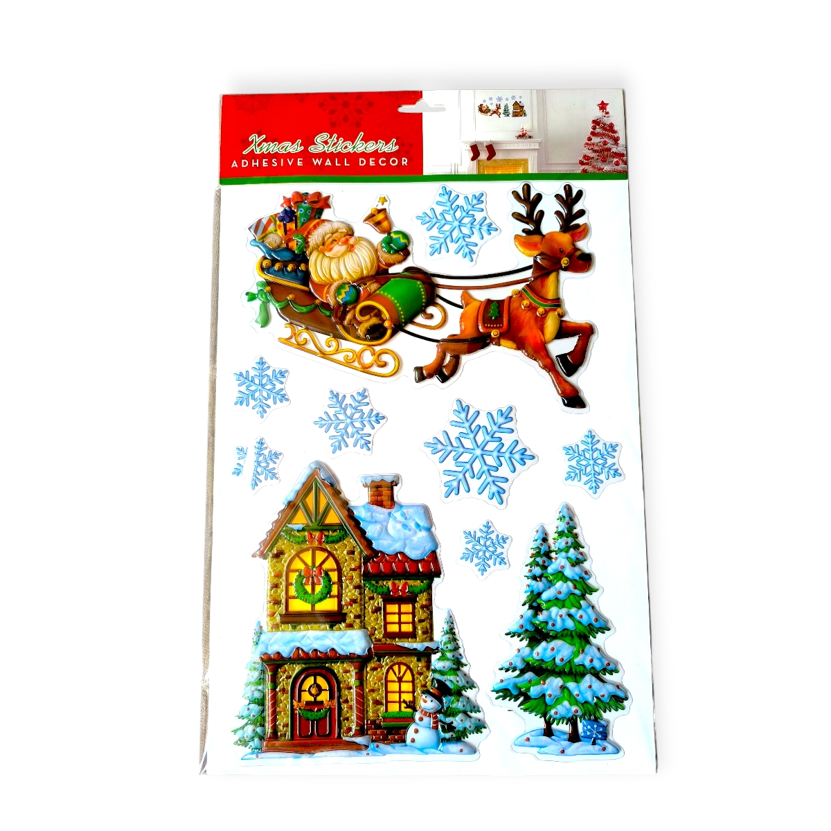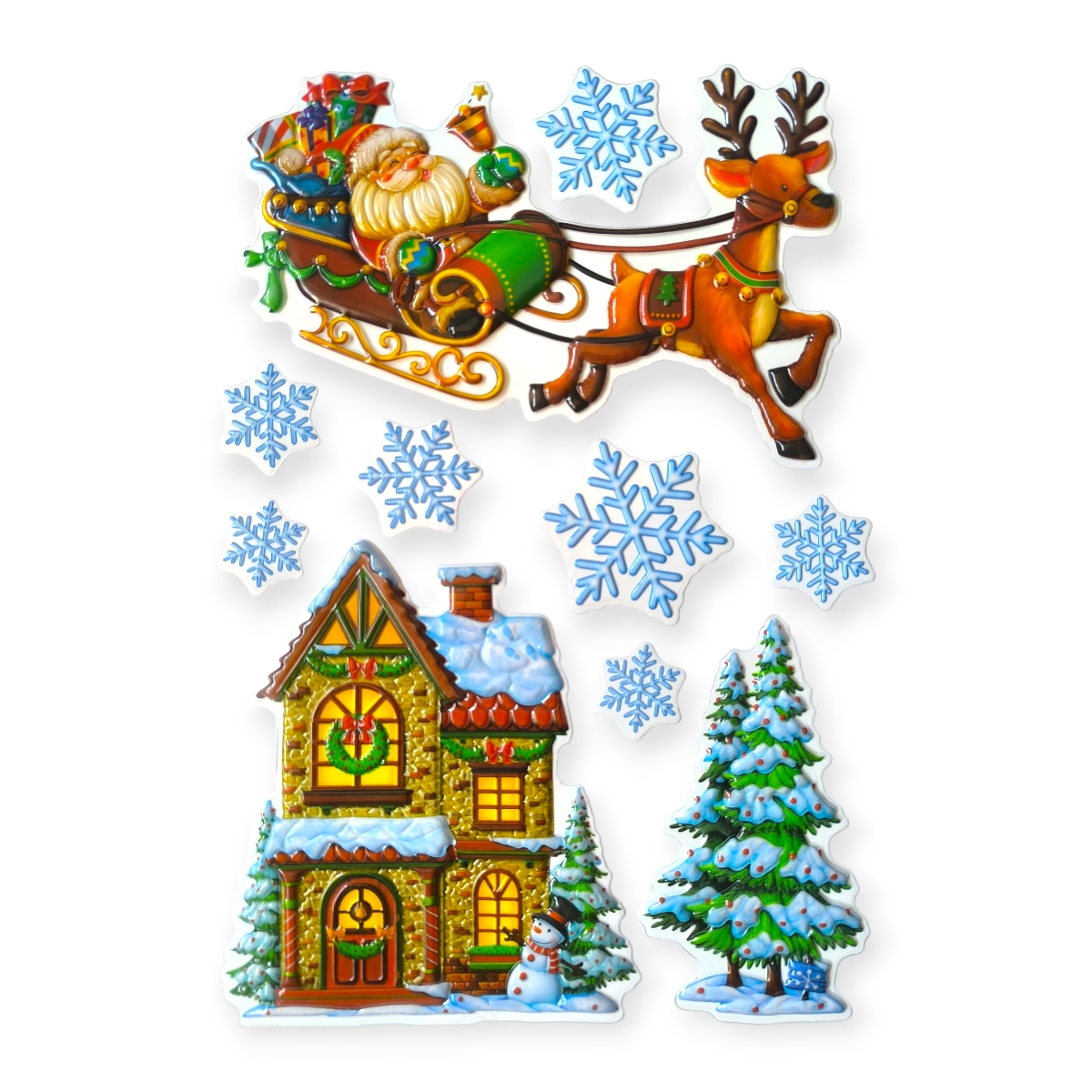 Dobd fel otthonod ezzel a színes karácsonyi matricával, amely házikót, fát, Mikulást szánnal és hópelyheket ábrázol. Tökéletes választás ablakok és tükrök díszítésére, hogy igazán meghitt és ünnepi légkört teremts.