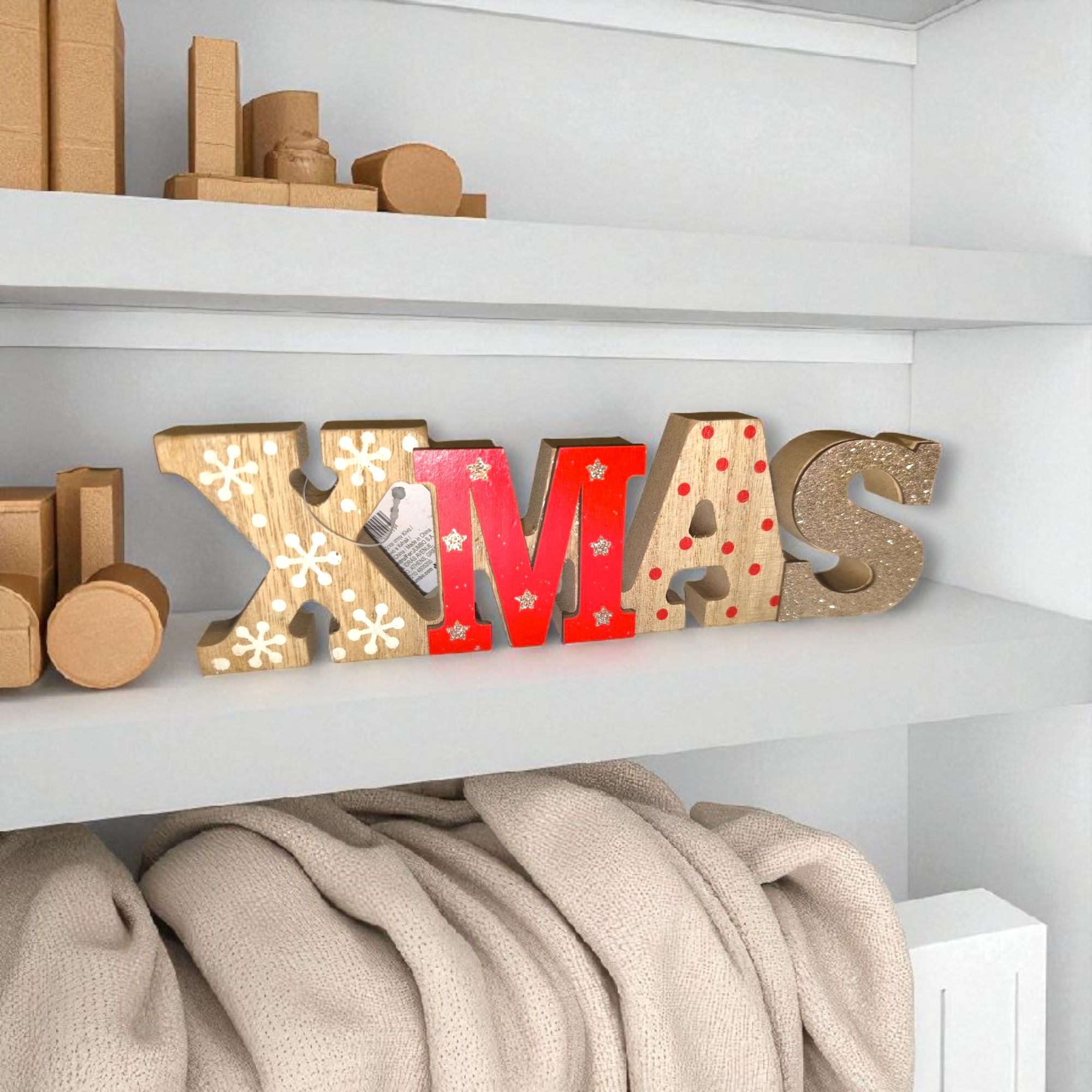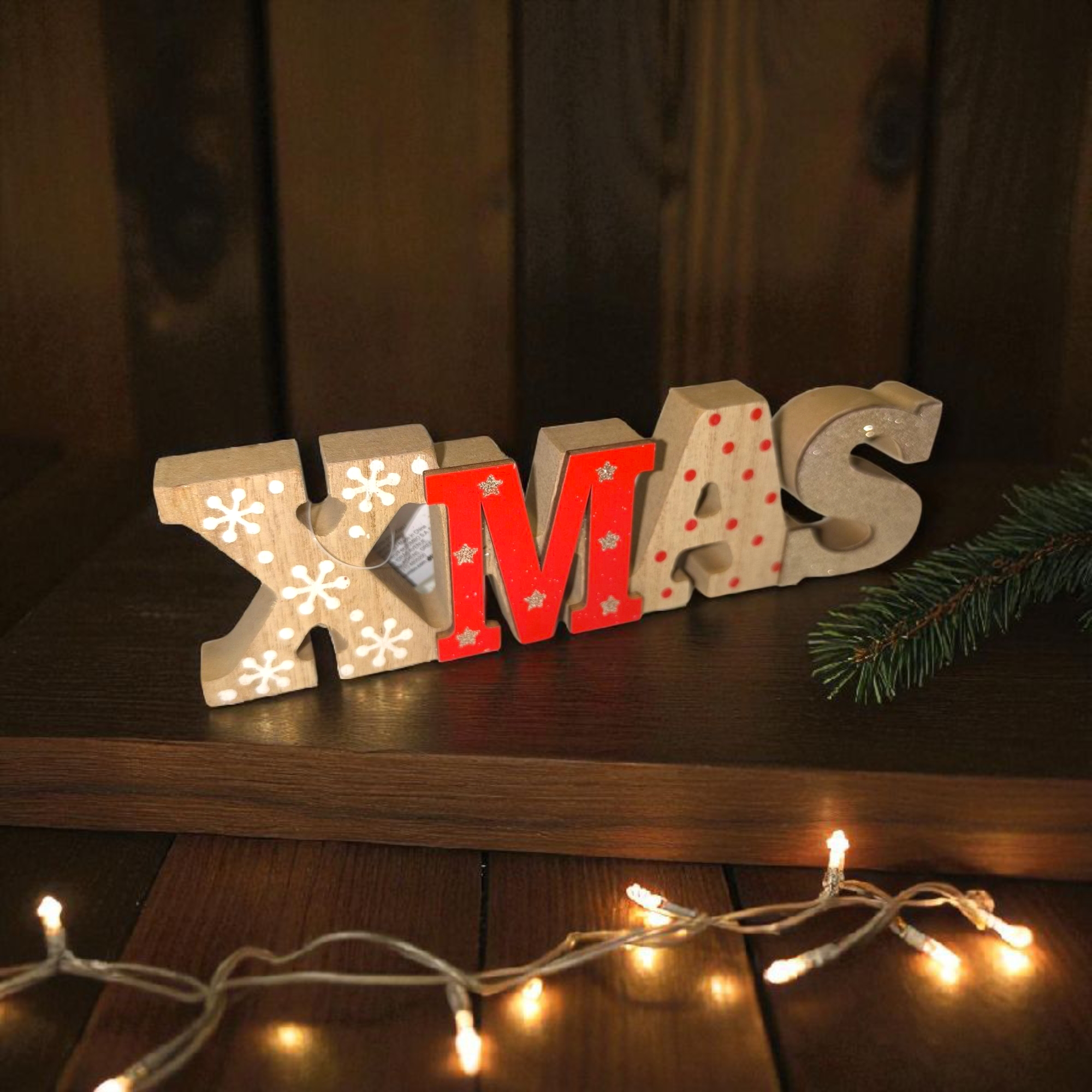 Hangulatos karácsonyi dekorációs tábla, fából készült, arany csillogó részletekkel díszítve. Ideális asztali vagy polcdíszként, hogy ünnepi fényt és meghittséget vigyen az otthonba.
