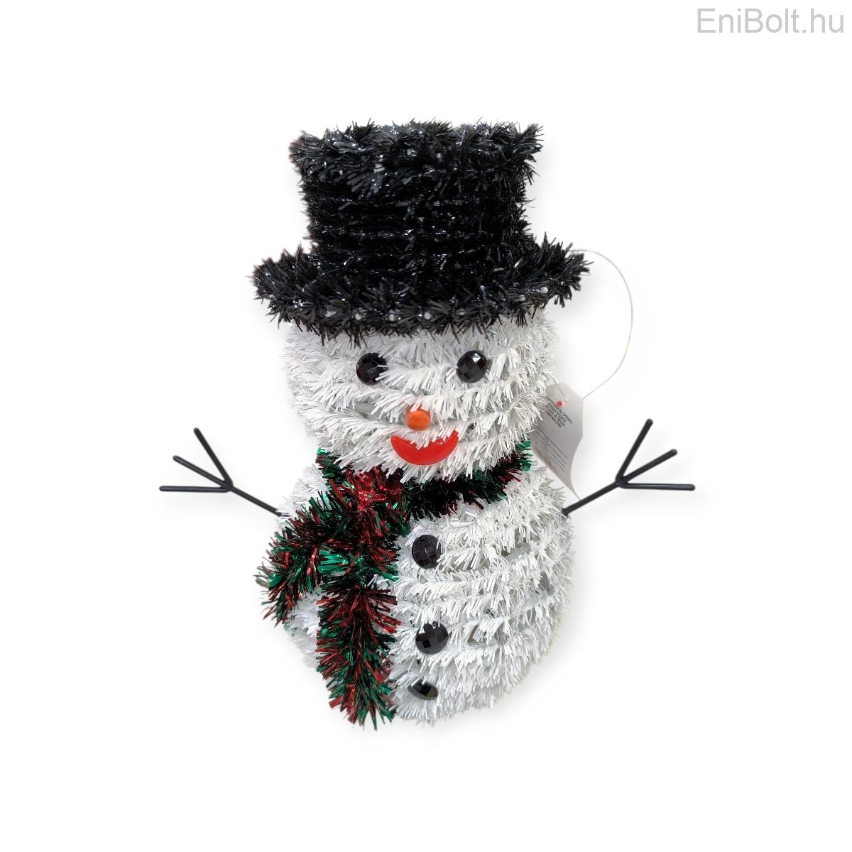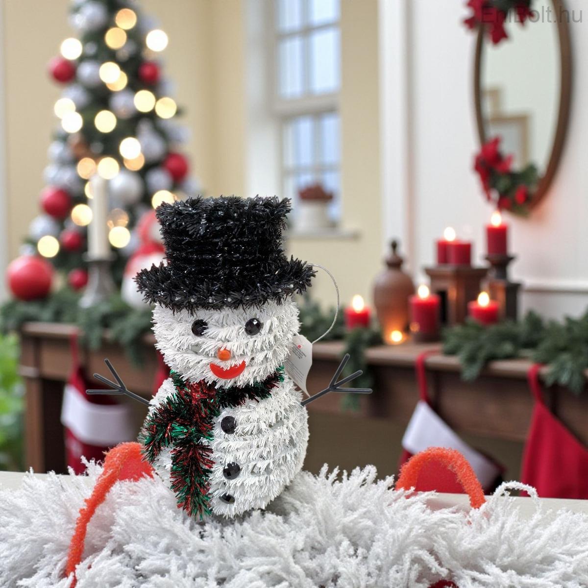 Dekoratív karácsonyi hóember fekete talmi kalappal és barátságos mosollyal, amely vidámságot visz minden otthonba. Klasszikus ünnepi dekoráció, amely remekül mutat az asztalon, polcon vagy a karácsonyfa mellett.