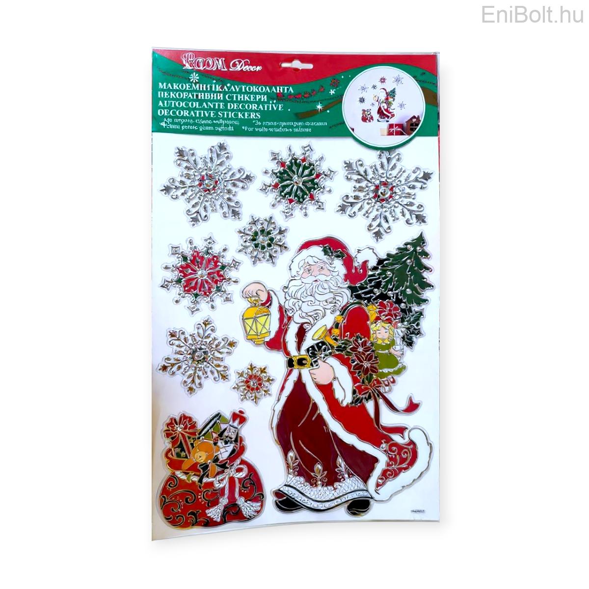 Dekoratív karácsonyi matricák, piros, zöld és ezüst színekben, dombornyomott textúrával. A Mikulás figurája ajándéktáskával, karácsonyfával és lámpással együtt varázslatos ünnepi hangulatot teremt otthonodban.