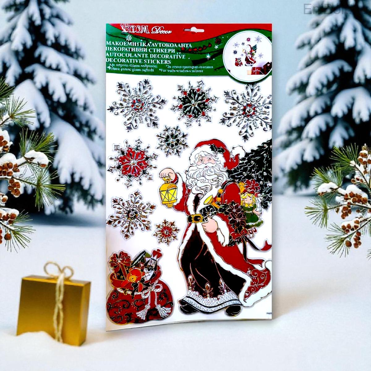 Kezdőlap » Karácsonyi dekorációk » Karácsonyi matricák » Karácsonyi dekoratív matricák Mikulás ajándéktáskával és pelyhekkel 28x41cm