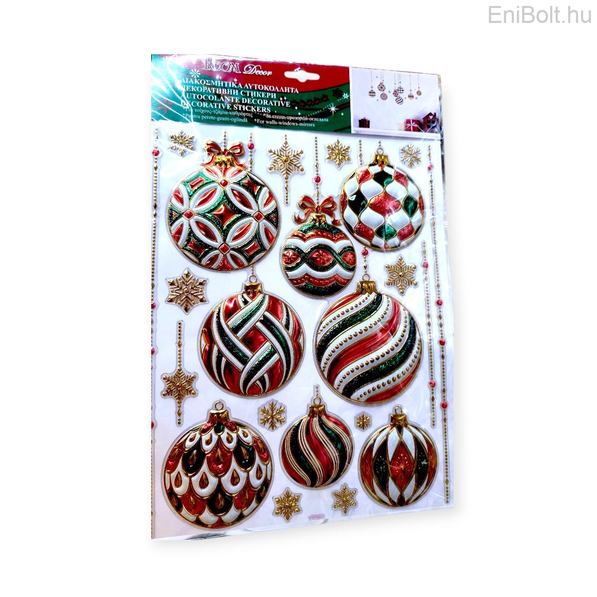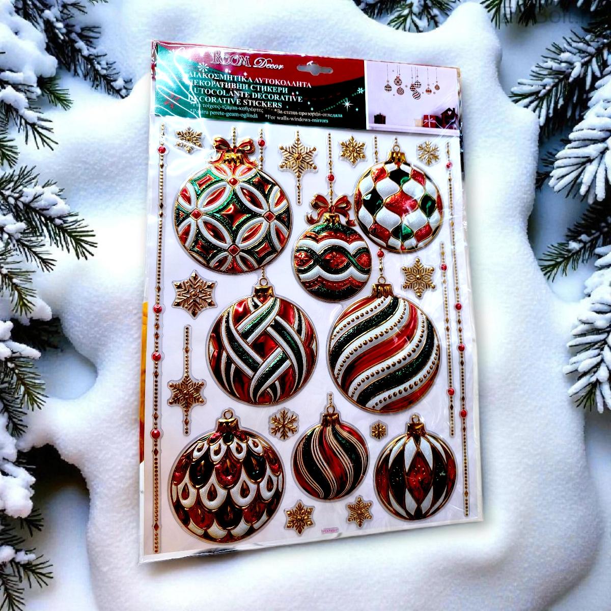 Dekoratív karácsonyi matricák, fémesen csillogó színes gömbökkel és arany hópelyhekkel. Tökéletes választás falak, ablakok vagy tükrök ünnepi díszítéséhez, hogy otthonodba varázslatos karácsonyi hangulatot teremts.