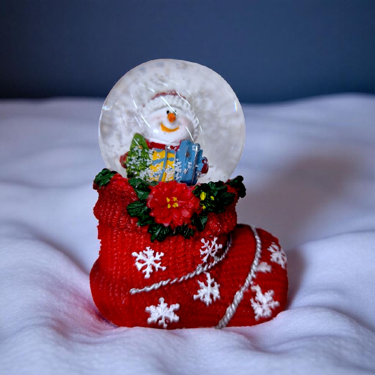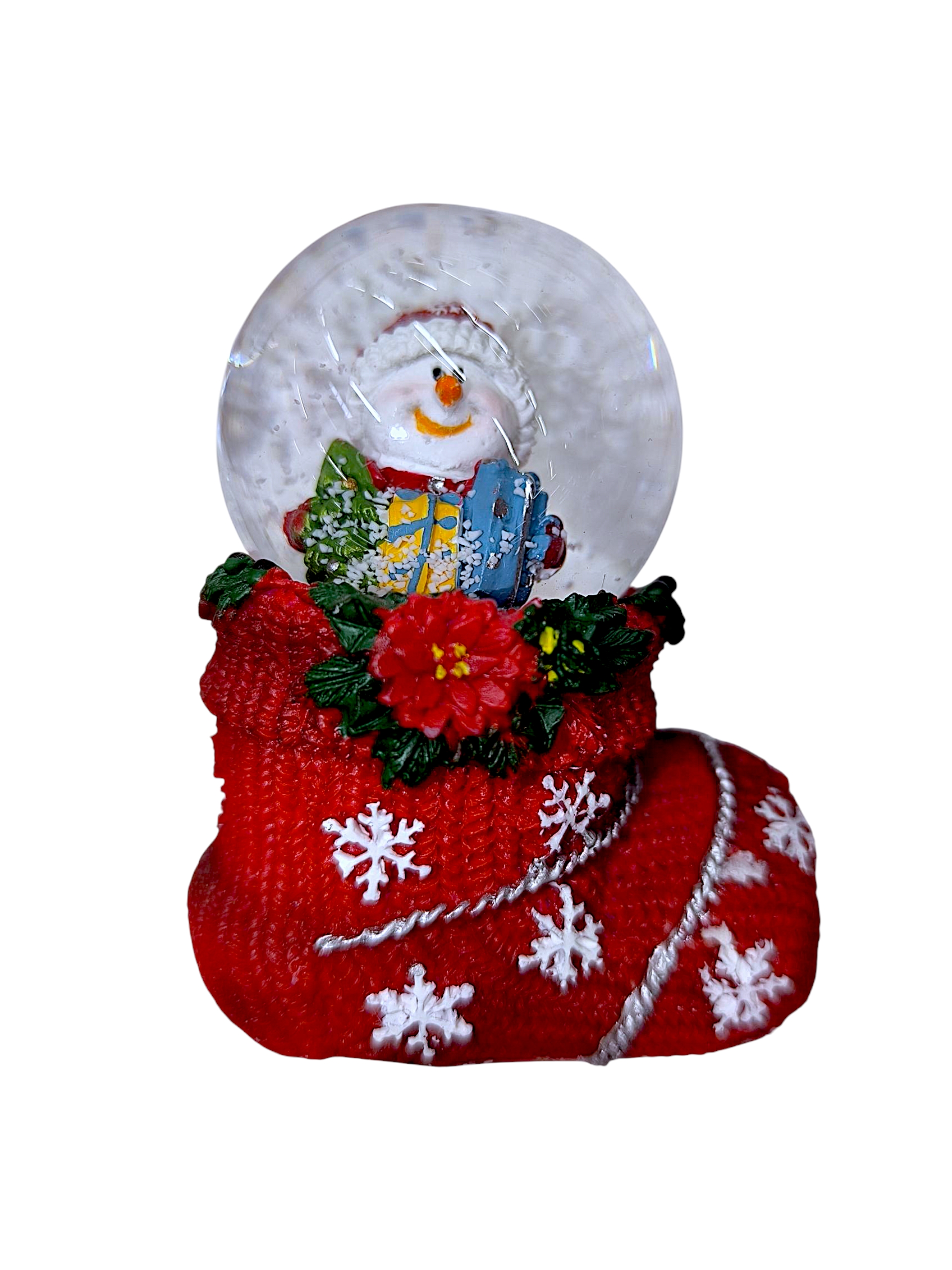 Dekoratív karácsonyi hógömb Mikulással és ajándékokkal, piros csizma alakú alapon. Részletgazdag, ünnepi dísz, amely meghitt hangulatot varázsol otthonodba.