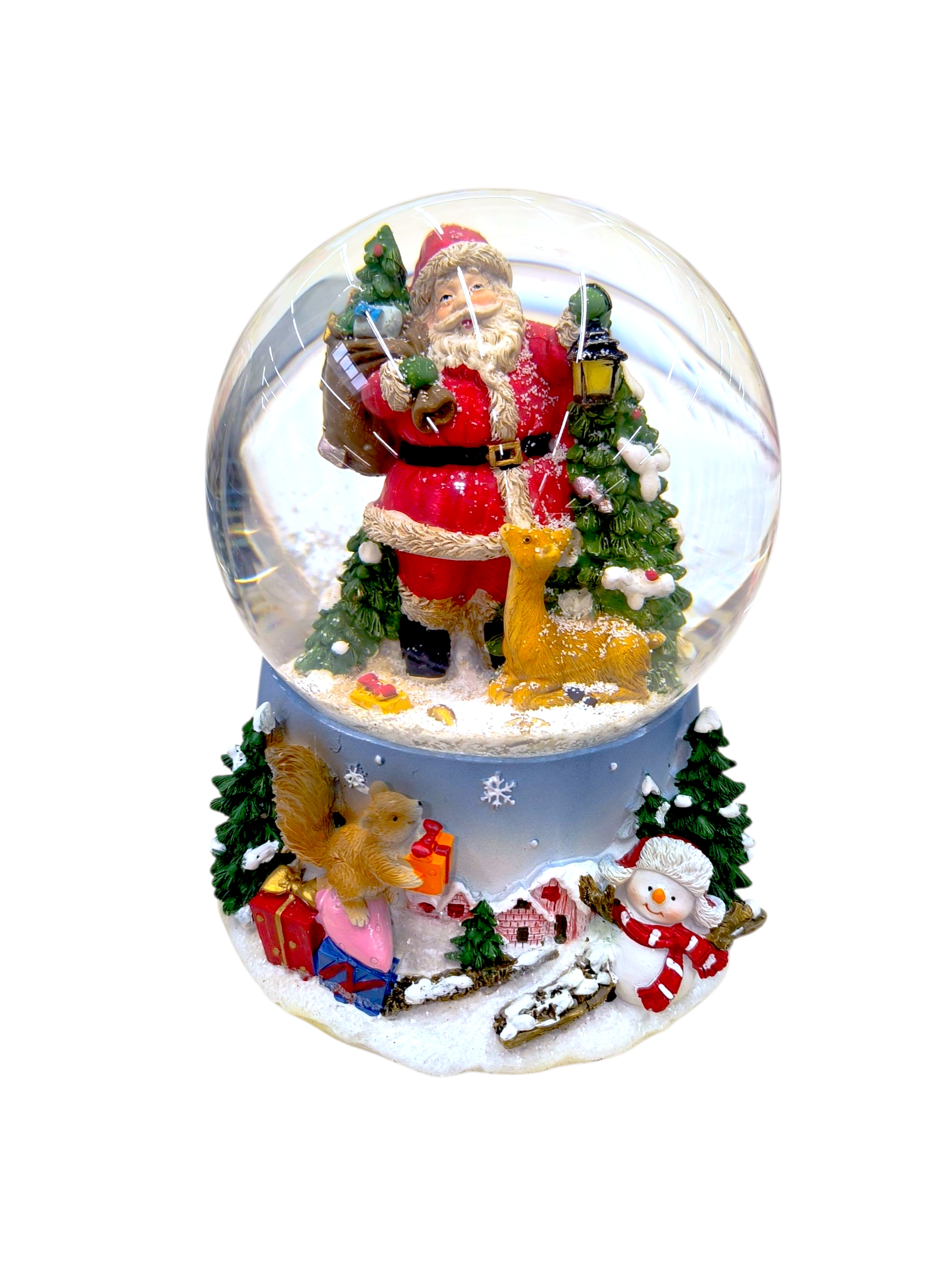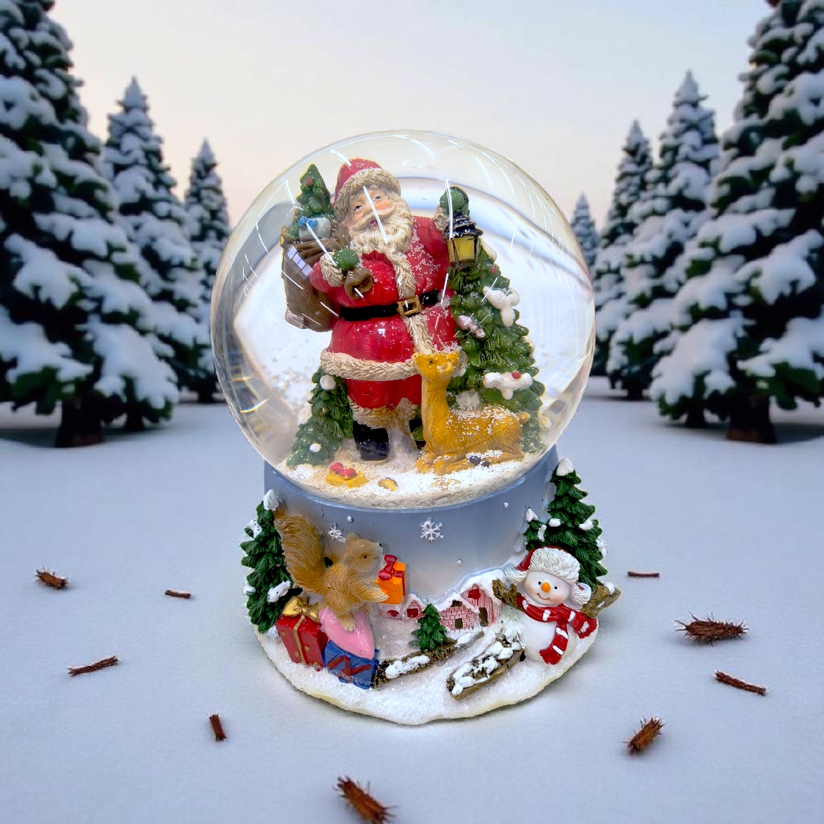 Varázslatos karácsonyi hógömb, amelyben Mikulás és hóember állnak a hóban, ajándékokkal teli zsák mellett. A részletgazdag, faragott havas talapzat és a LED világítás igazi ünnepi hangulatot teremt.