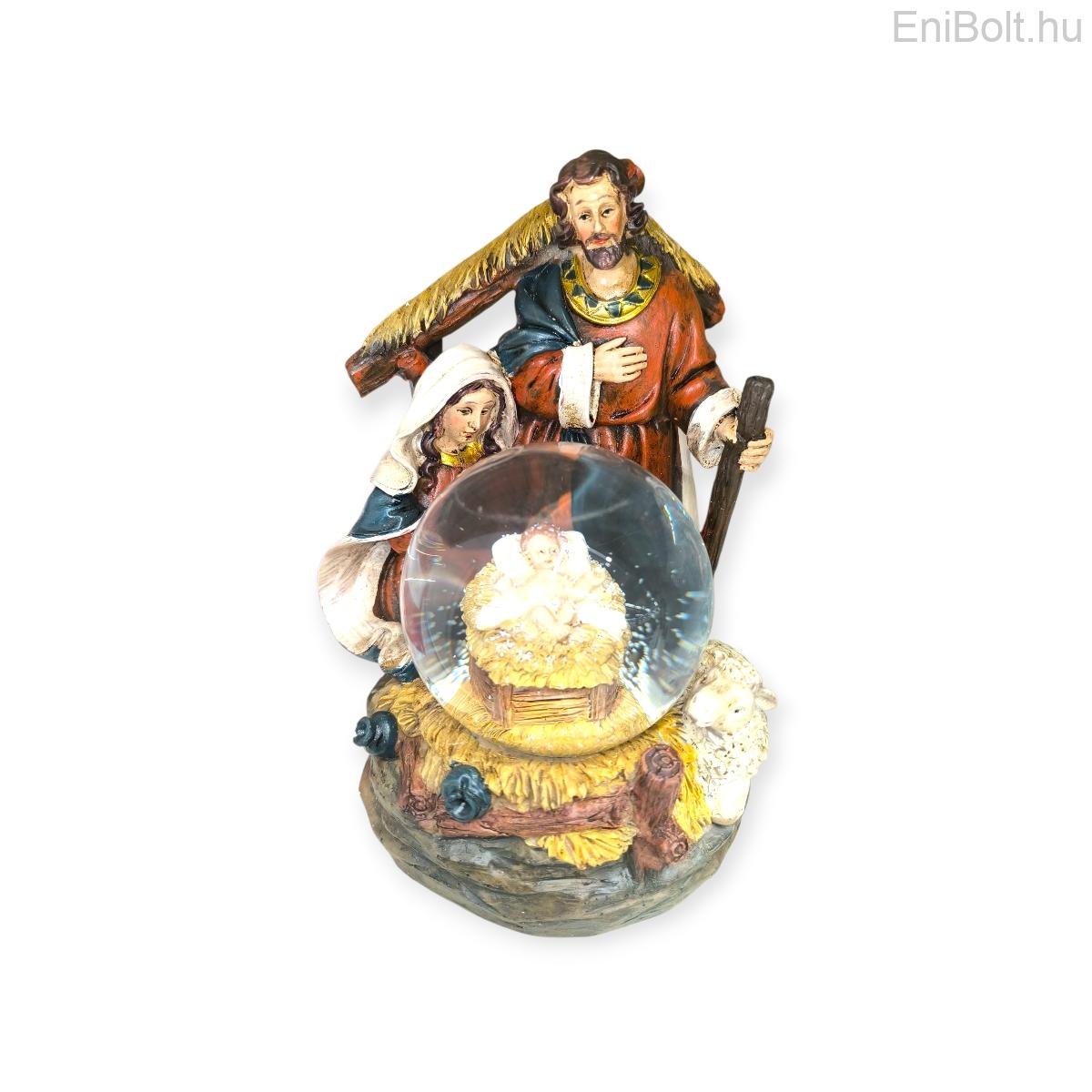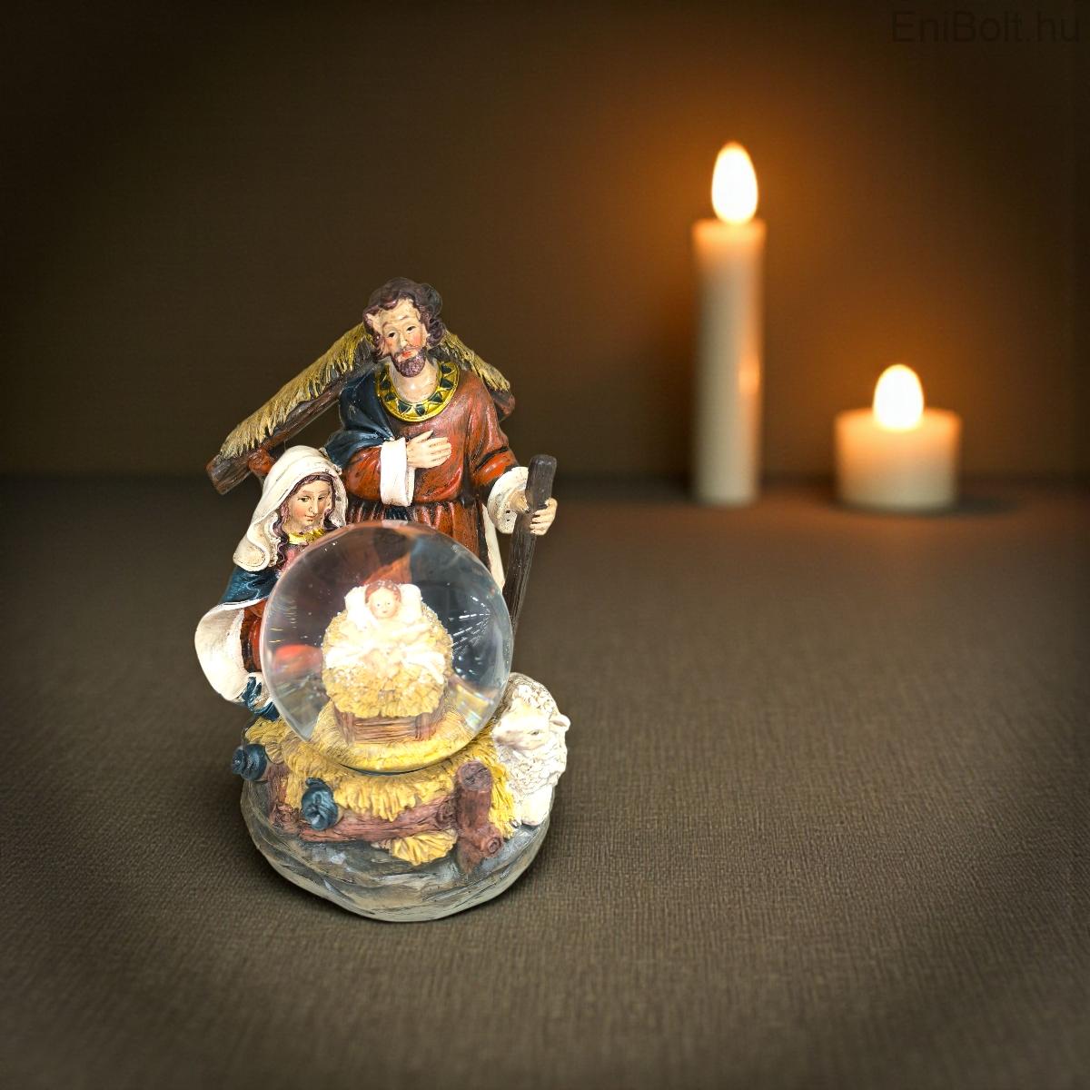Dekoratív karácsonyi hógömb, amely betlehemes jelenetet ábrázol LED-fénnyel és zenével. A meleg fények és a lágy dallamok különleges ünnepi hangulatot teremtenek.