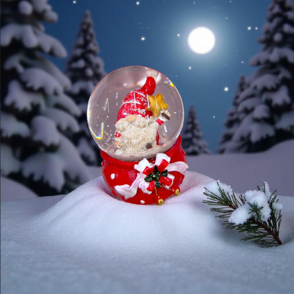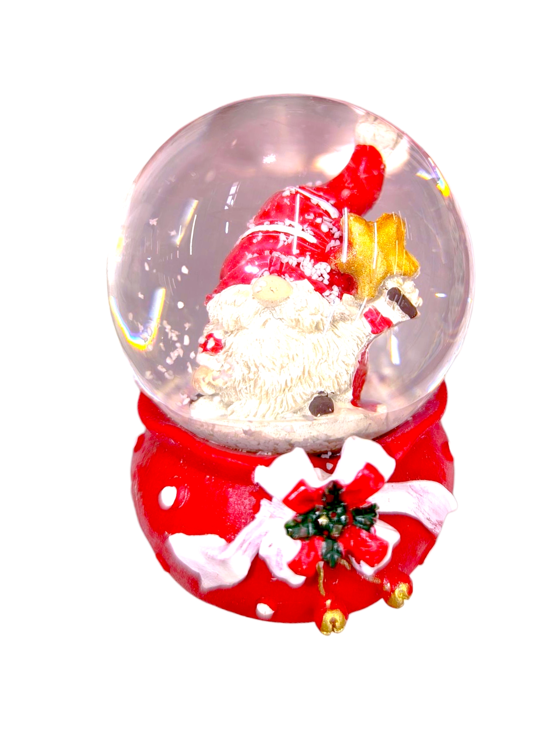 Bájos karácsonyi hógömb arany csillagot tartó gnóm figurával, piros alapon, fehér szalaggal díszítve. Tökéletes ünnepi dekoráció vagy ajándék, ami melegséget visz otthonodba.