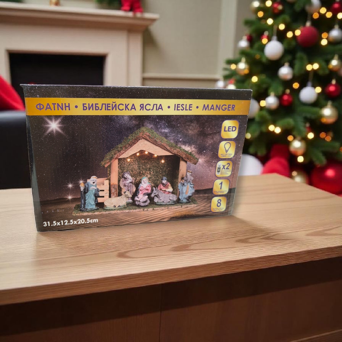 Kezdőlap » Karácsonyi dekorációk » Betlehemek, Mikulás csizmák » Karácsonyi jászol LED világítással és 9 figurával – Betlehem 31x12,5x20 cm