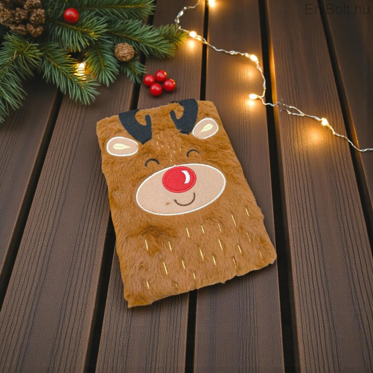 Karácsonyi hangulatú jegyzetfüzet puha barna műszőrme borítóval és aranyos rénszarvas mintával. A 3D-s szarvakkal díszített dizájn különlegessé teszi, tökéletes választás ünnepi jegyzeteléshez vagy ajándéknak.