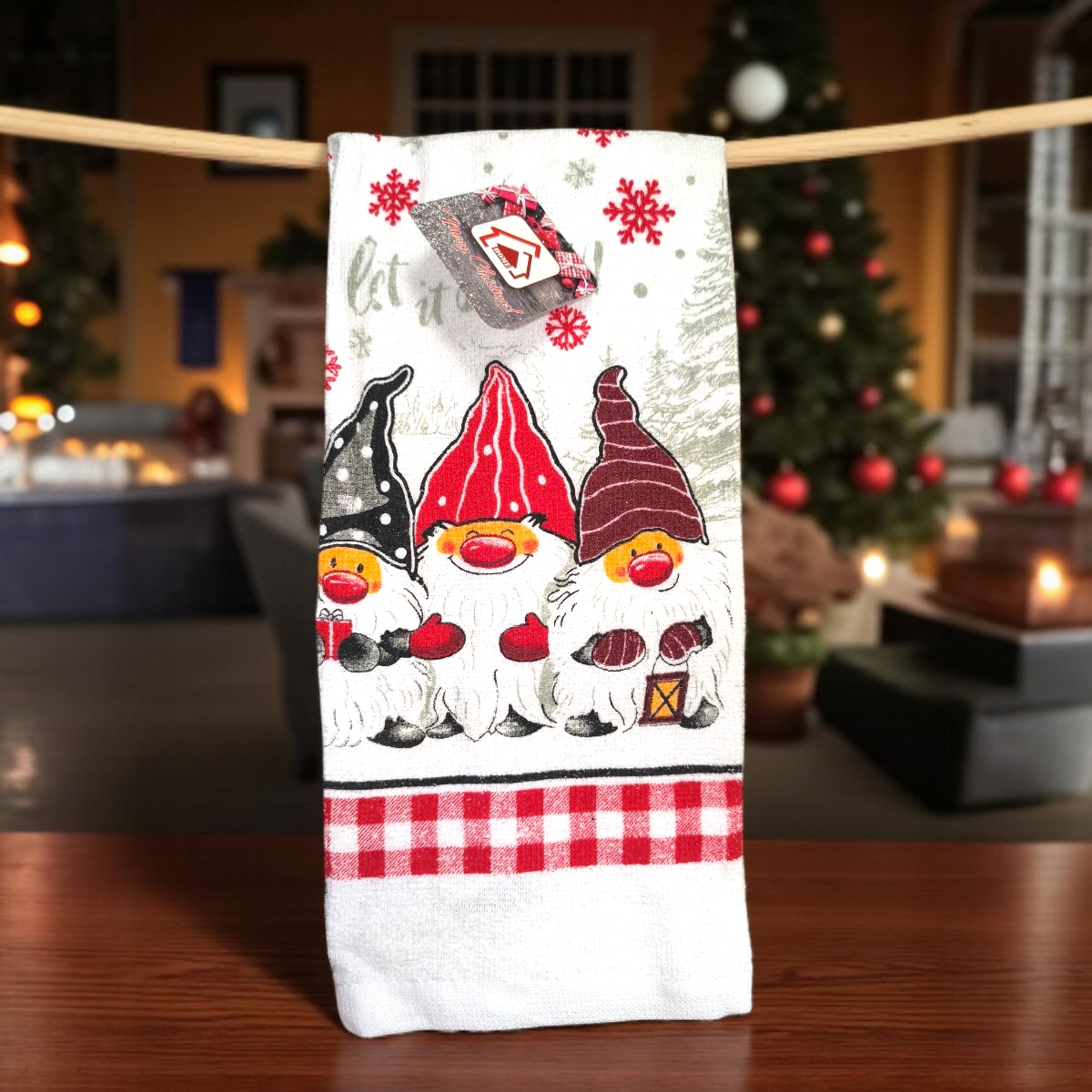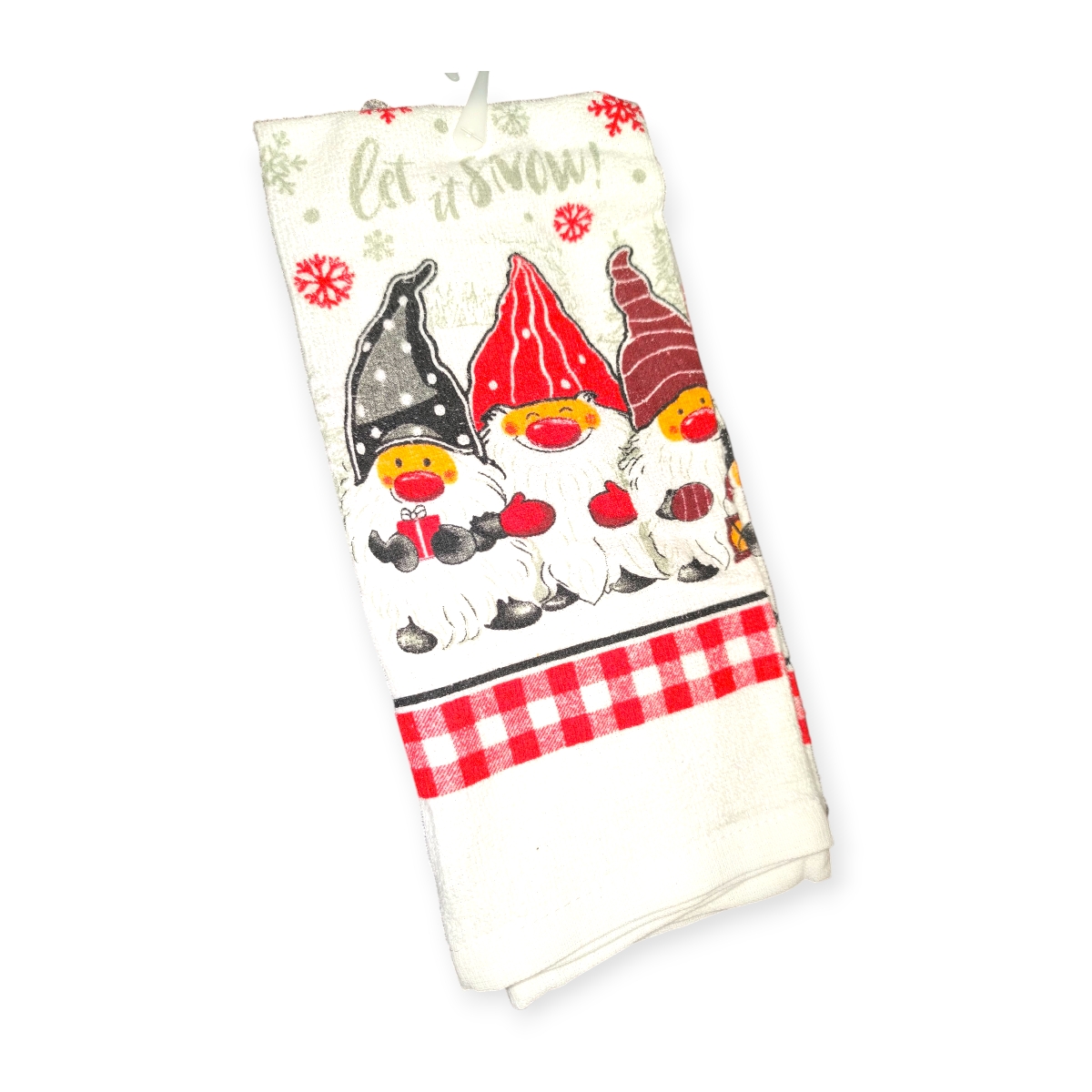 Karácsonyi pamut konyharuha fehér alapon, piros kockás szegéllyel, vidám Mikulás gnóm mintával és „Let it snow” felirattal. A hópelyhes díszítés ünnepi hangulatot varázsol a konyhába. Praktikus és dekoratív kiegészítő, amely tökéletes ajándék is lehet.