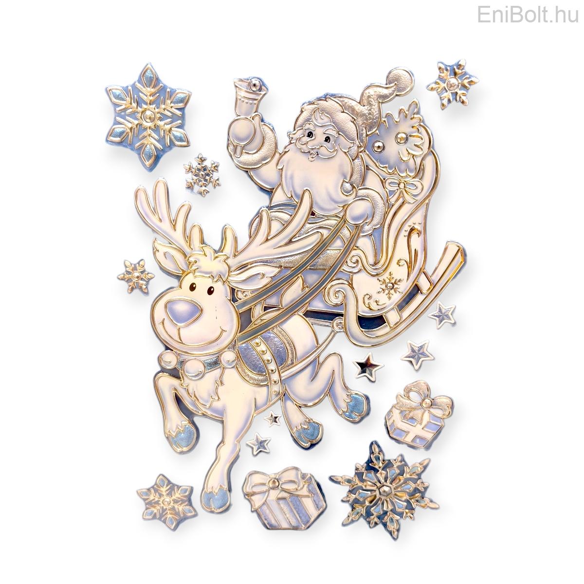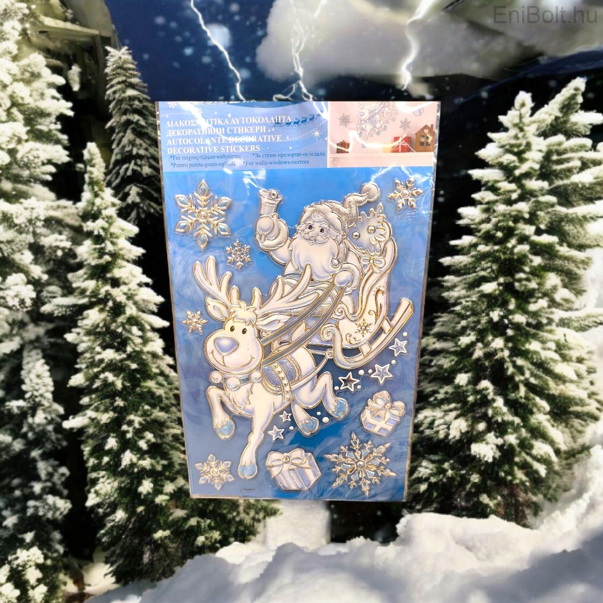 Varázsold otthonodba a karácsony hangulatát ezzel a karácsonyi matricával, amely Mikulást rénszarvasszánnal, ajándékokkal és ezüst-kék hópelyhekkel ábrázol. A dombornyomott textúra különleges fényt és eleganciát kölcsönöz, így bármely felületet – legyen az ablak, fal vagy tükör – mesebelivé varázsol.