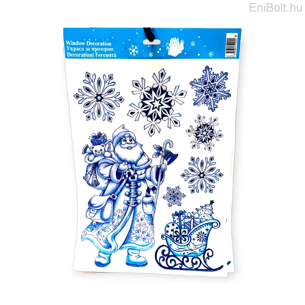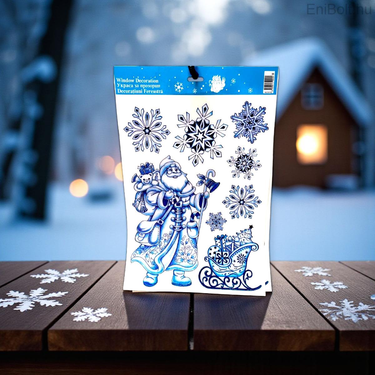 Karácsonyi matrica – Mikulás szánpelyhek irizáló kék csillámmal 30x38cm