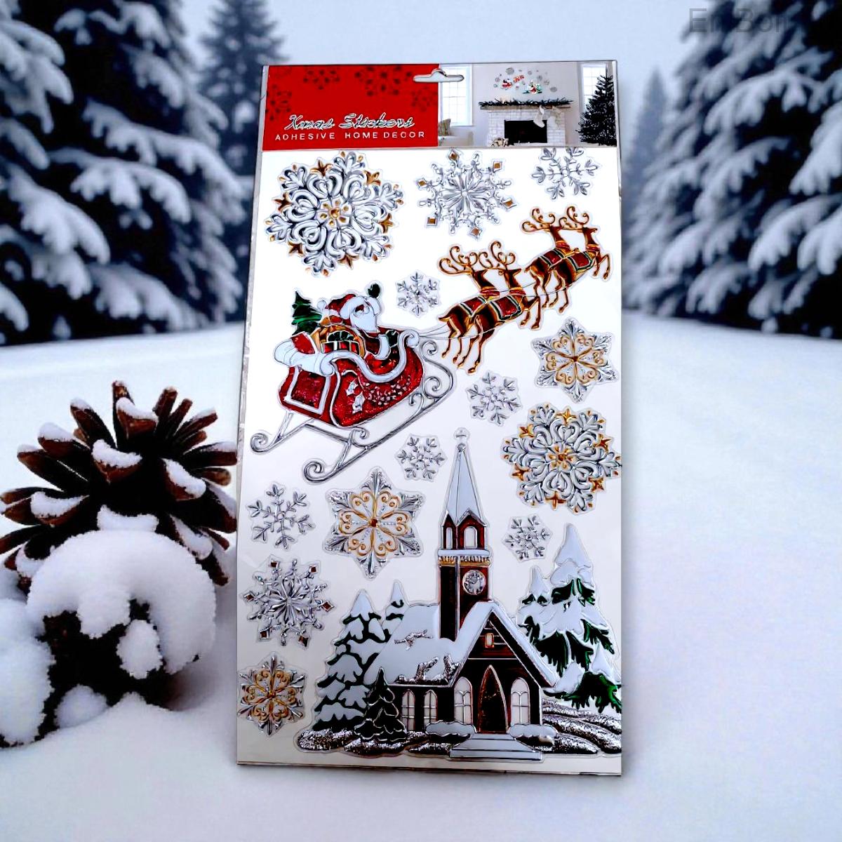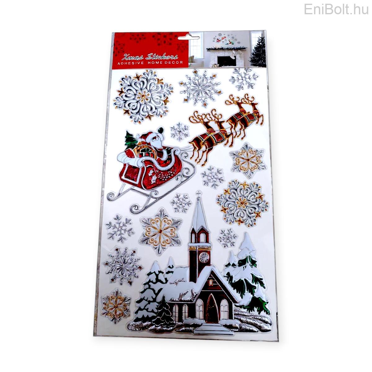 Dekoratív karácsonyi matrica Mikulás szánnal és templommal