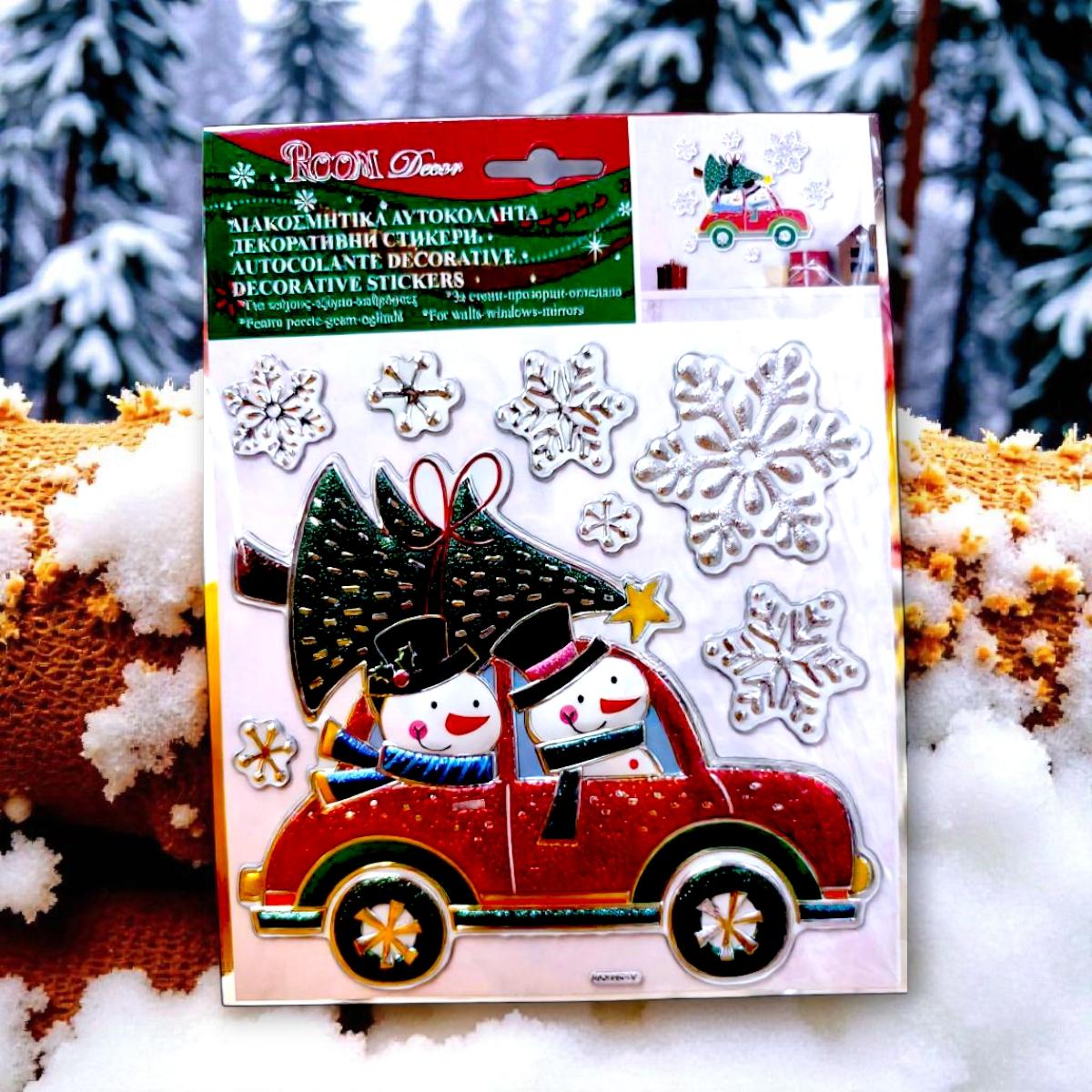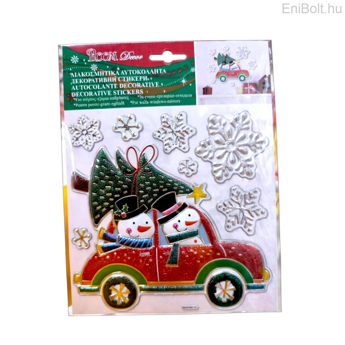 Karácsonyi matrica autóval és hóemberrel, ezüst pelyhekkel 18x23cm