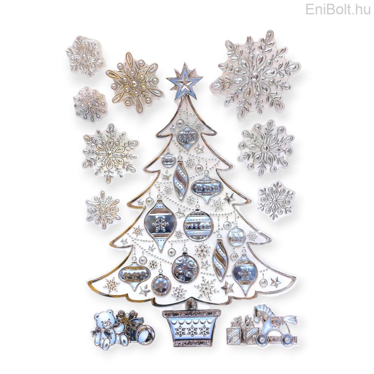 Karácsonyi matrica ezüst fenyőfával, pelyhekkel és ajándékokkal 29x41cm