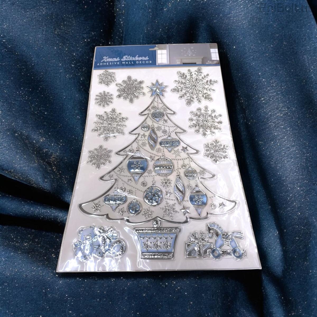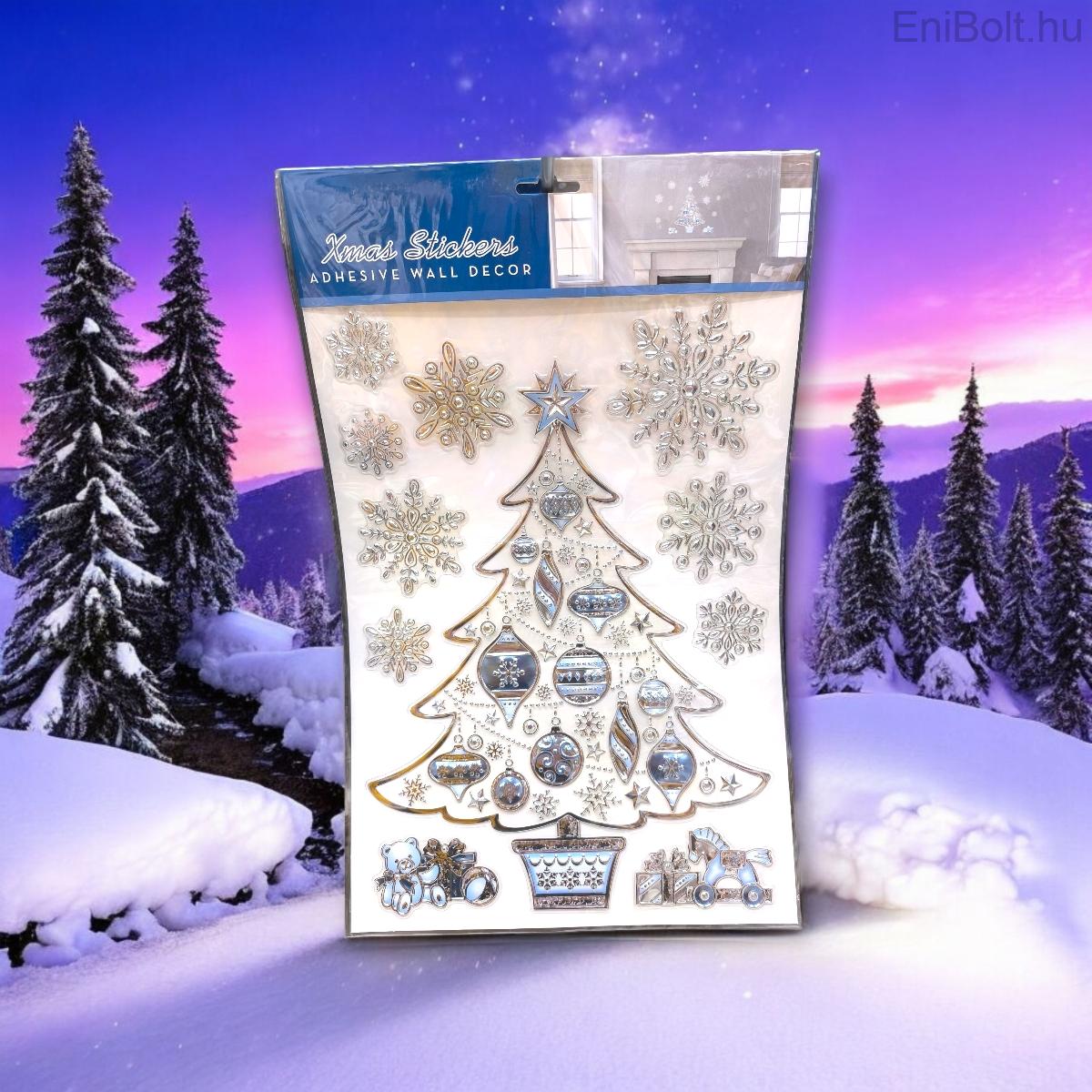 Varázsold ünnepivé otthonod ezzel a dekoratív karácsonyi matricával, amely ezüst fát, hópelyheket és ajándékokat ábrázol. Tökéletes kiegészítője az ünnepi dekorációnak, hiszen csillogó, elegáns megjelenésével falakon, ablakokon vagy tükrökön is gyönyörűen mutat.